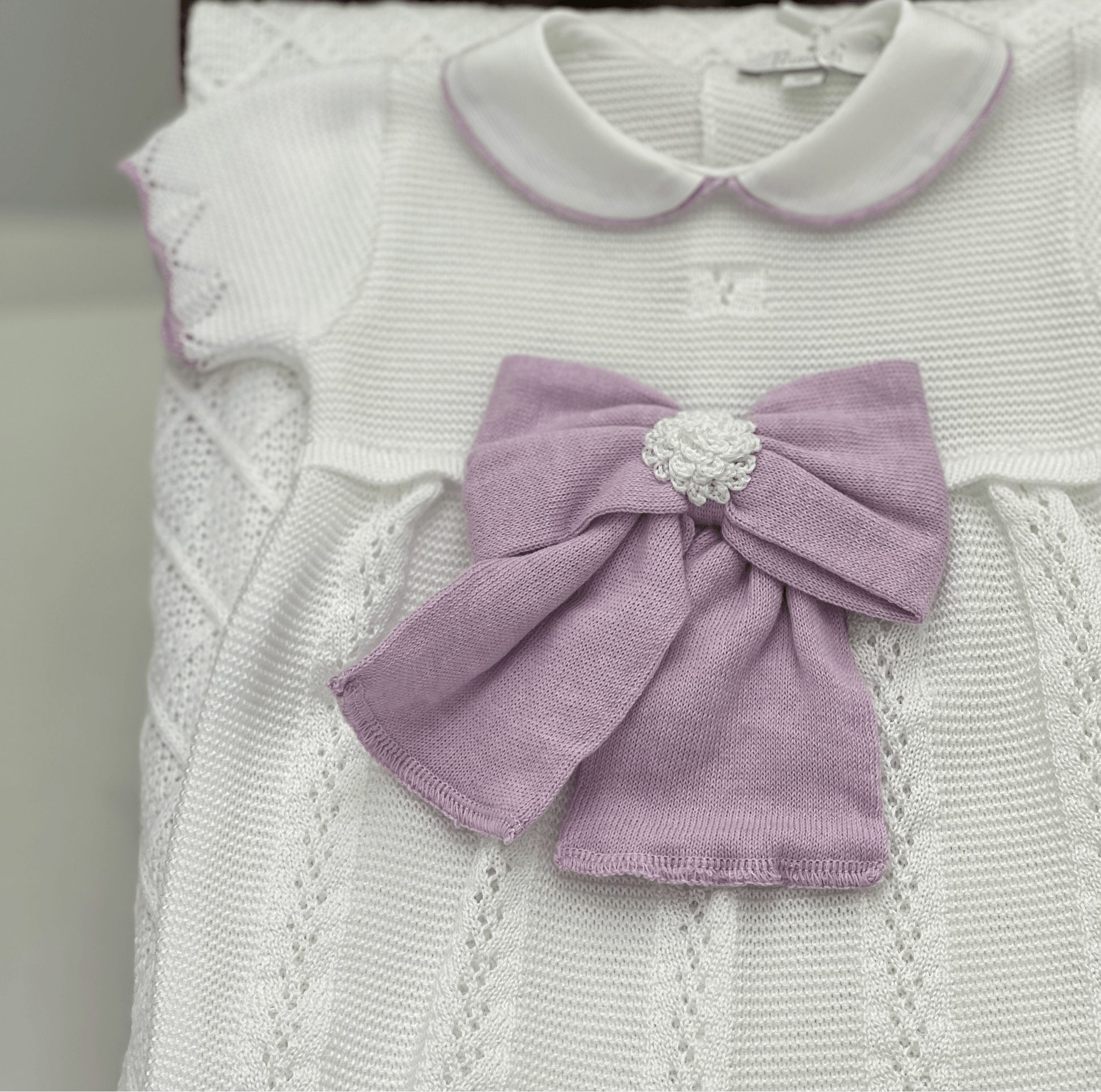 Una tutina corta in puro cotone lavorato con cura, caratterizzata da trafori raffinati e bordini lilla che ne esaltano l’eleganza. Il fiocco centrale completa il capo con un dettaglio delicato, ideale per le giornate più miti e per le prime occasioni speciali della tua piccola.