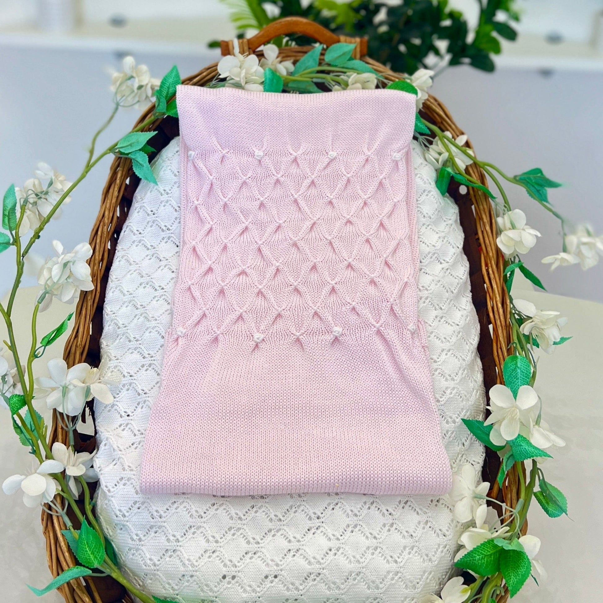 Copertina in cotone rosa, lavorata a maglia con delicati dettagli in punto smock e piccoli fiorellini ricamati a mano. Morbida e traspirante, perfetta per avvolgere la neonata con eleganza e dolcezza.