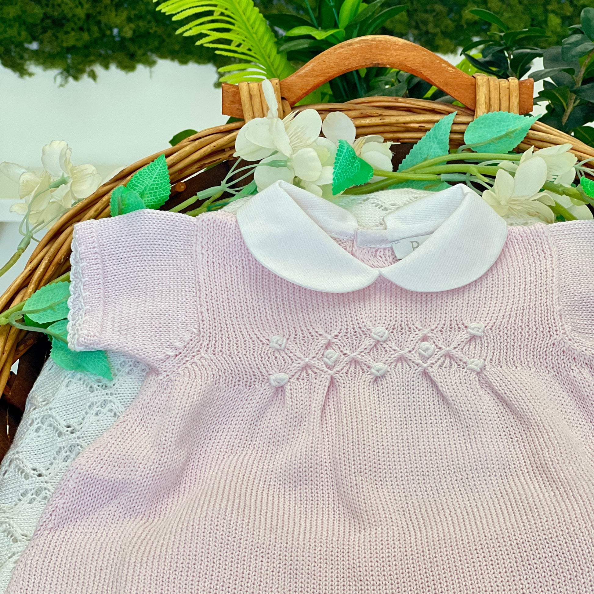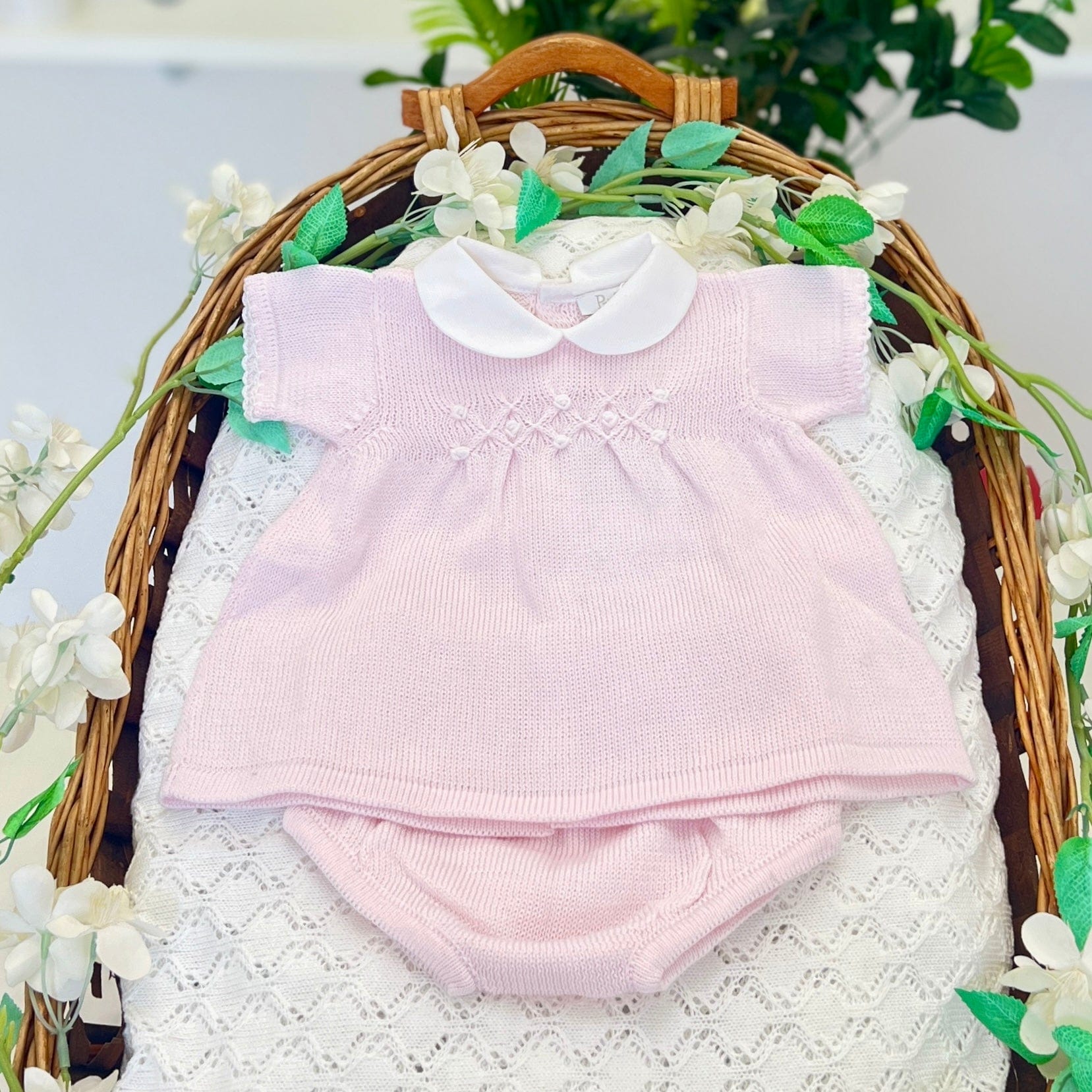 Completo corto per neonata, composto da maglia svasata in cotone rosa e culotte coordinate. Dettagli in punto smock e ricami delicati, per un look fresco e sofisticato.