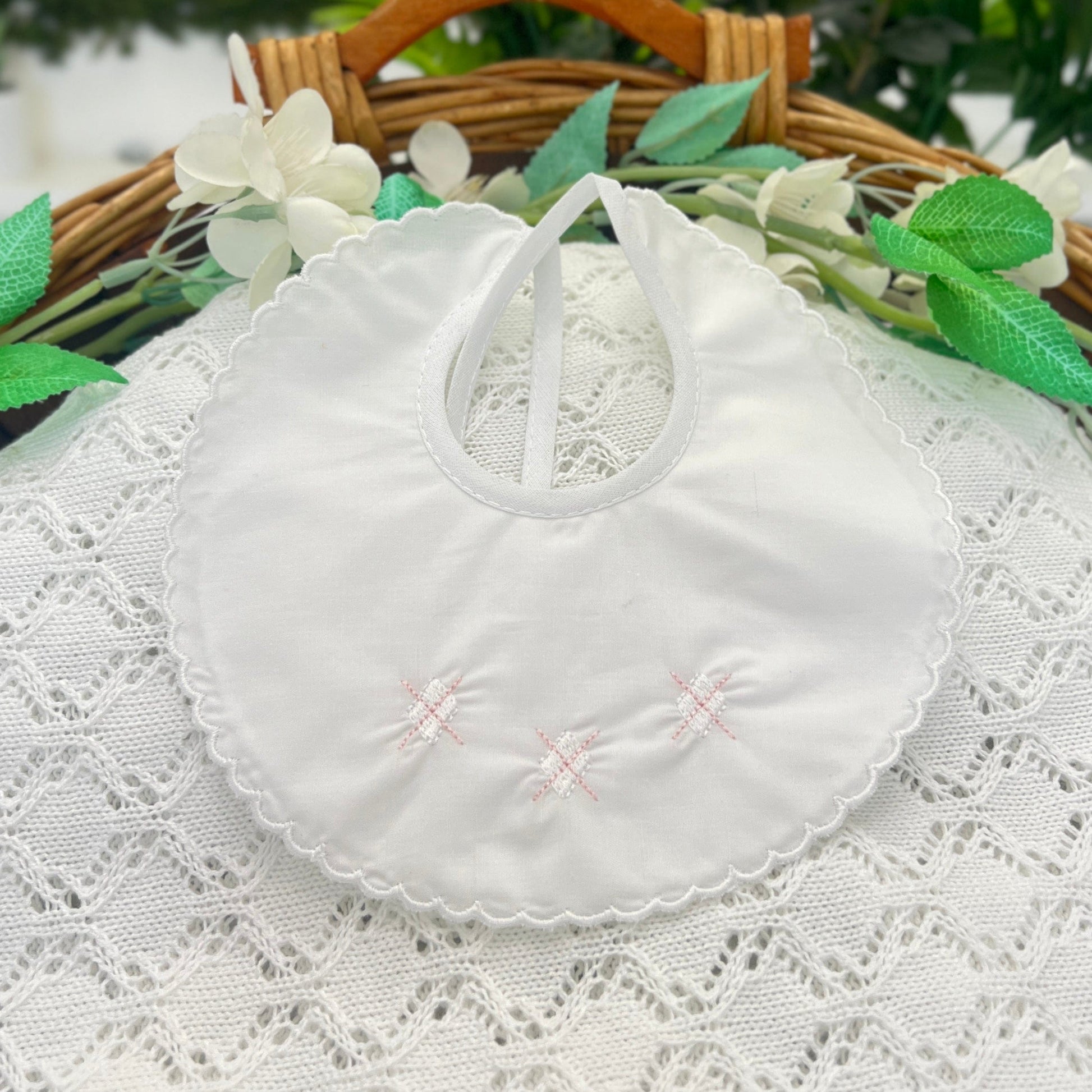 Bavetta in puro cotone, con elegante smerlo e ricamo centrale a mano. Morbida e delicata, ideale per la neonata, un tocco raffinato per ogni momento della giornata.