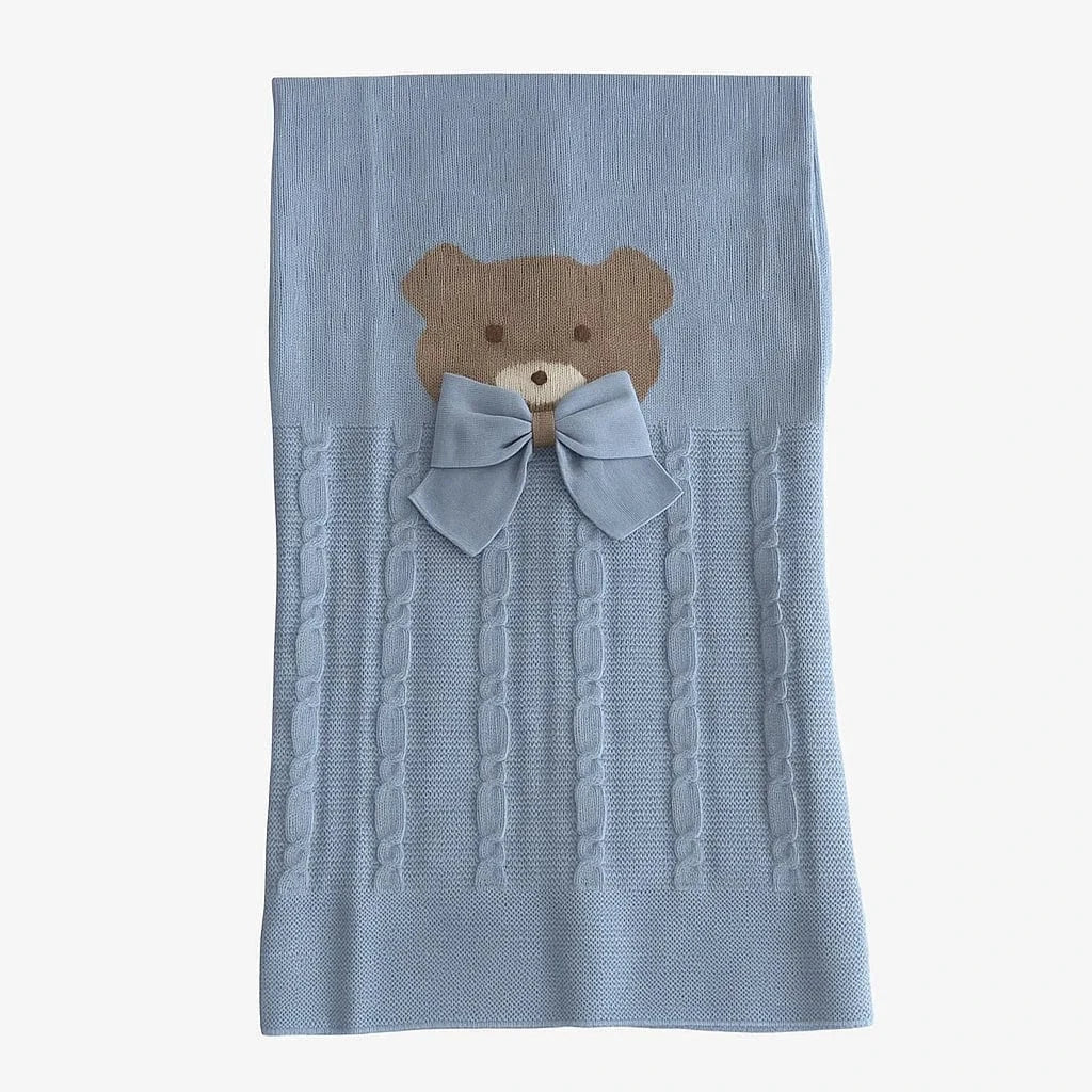 Coperta in pura lana per neonato con trama intrecciata, fiocco in lana e inserto in tela con orsetto ricamato. Morbida e avvolgente, ideale per culla o carrozzina.