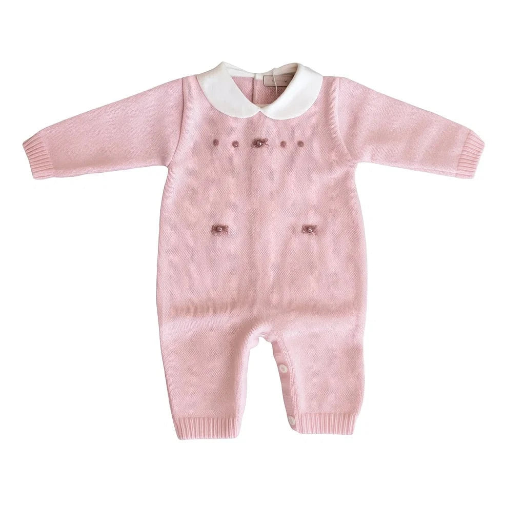 Tutina intera in pura lana per neonata, con colletto e delicate roselline ricamate a mano sul petto. Calda, morbida e con chiusura pratica sul retro e al cavallo.