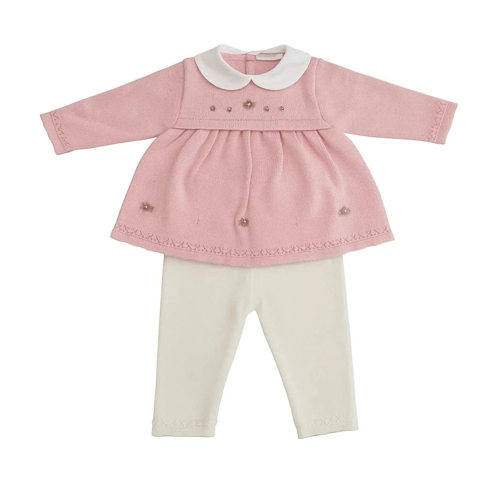 Tutina spezzata in pura lana per neonata con maglia ricamata a mano e colletto, abbinata a pantalone color latte a contrasto. Chiusura sul retro, pratica da indossare.