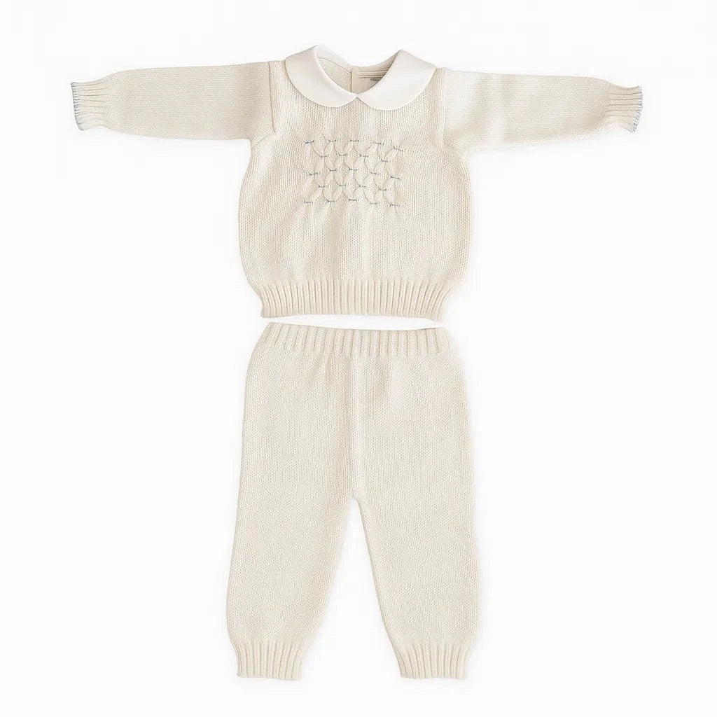 Tutina spezzata in pura lana, con maglia in punto smock e nodini celesti a contrasto, completata da colletto in piqué e pantalone coordinato. Chiusura sul retro per una vestibilità comoda.