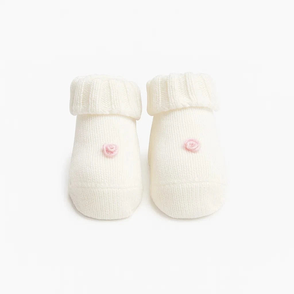 Babbucce in maglia per neonata con punto smock e roselline ricamate a mano. Morbide e perfette da abbinare al completo.