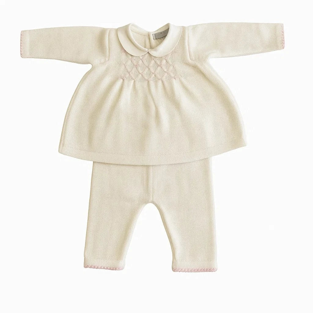 Tutina spezzata in maglia per neonata con maglia in punto smock e roselline ricamate a mano, abbinata a pantalone coordinato. Chiusura sul retro per un cambio pratico.