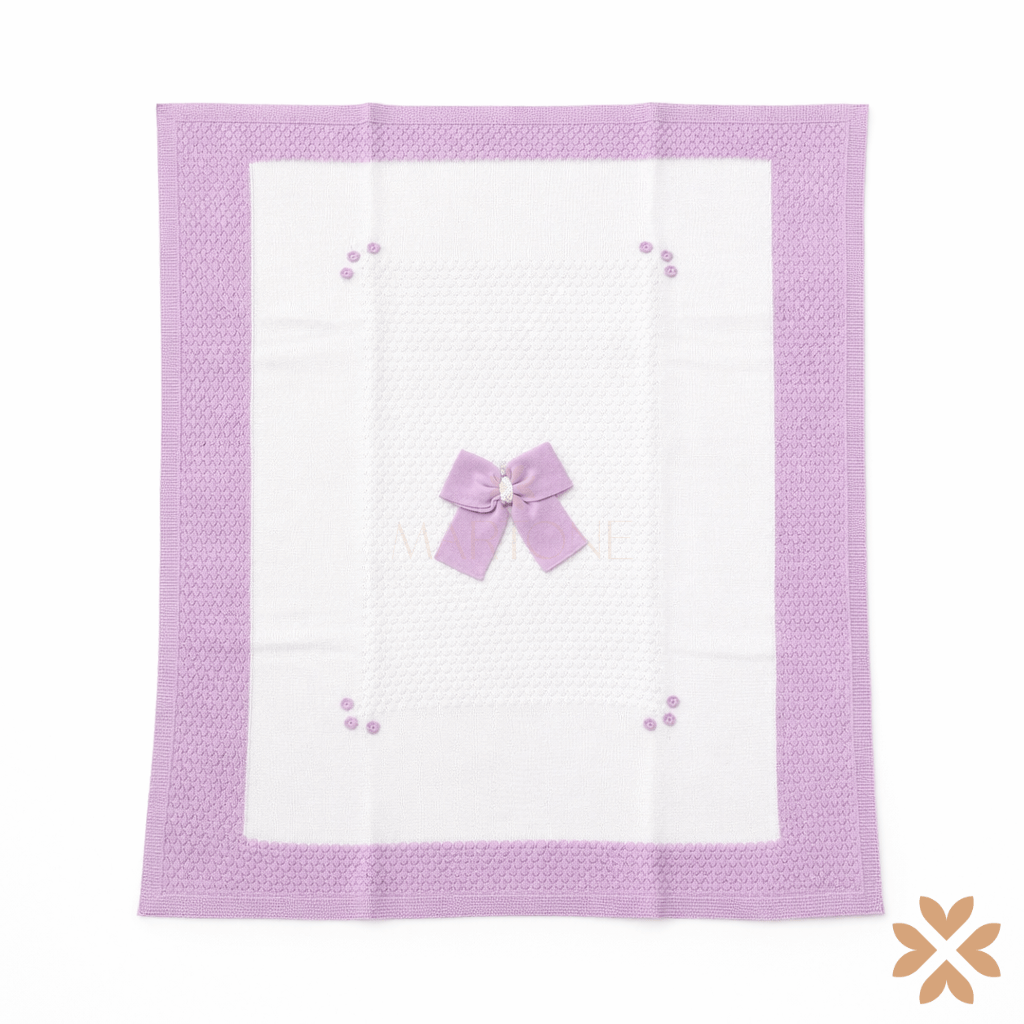 Coperta in filo a maglia con bordo rifinito e fiocco applicato centrale. Dettagli decorativi tono su tono. Ideale per culla e carrozzina. Filo leggero, lavorazione curata.