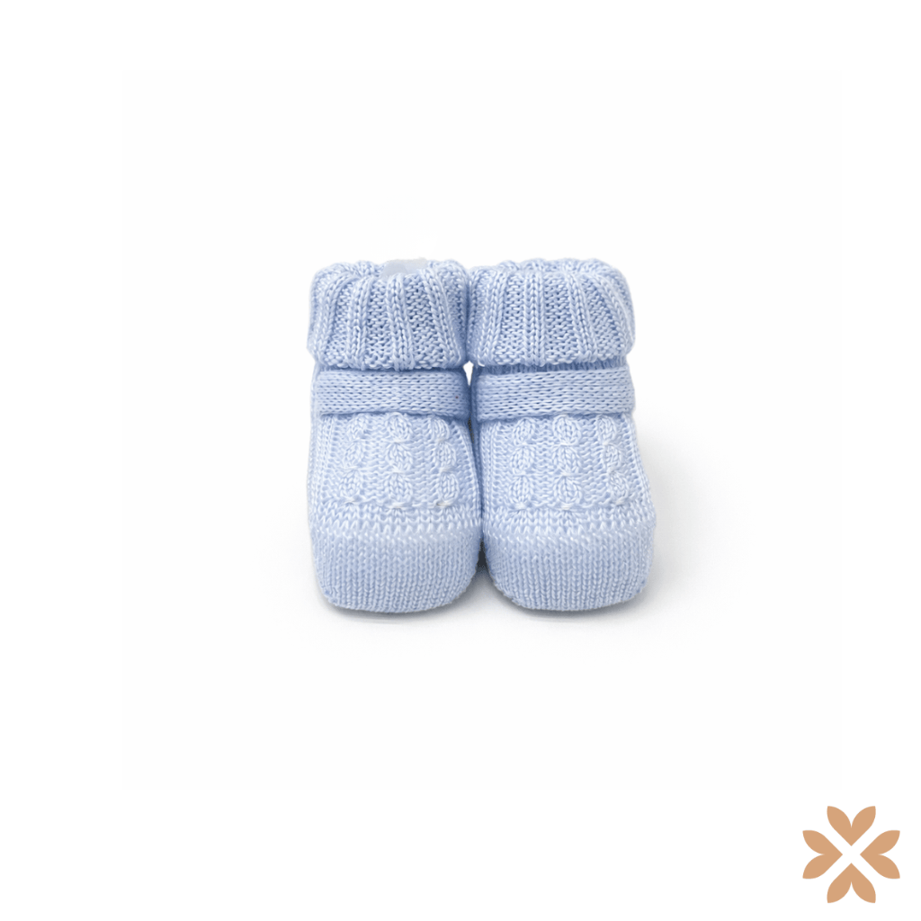 Babbucce in filo a maglia con lavorazione decorativa sul fronte e risvolto a costine. Modello morbido da culla, ideali per completare il corredino coordinato.