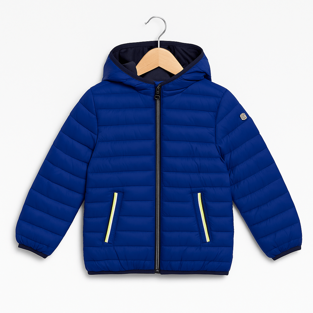 Piumino 100 grammi in colore blu elettrico, con cuciture orizzontali e dettagli a contrasto giallo sulle tasche. Dotato di cappuccio, zip frontale e fondo elasticizzato per una vestibilità pratica. Un modello leggero e funzionale, ideale per l’uso quotidiano.