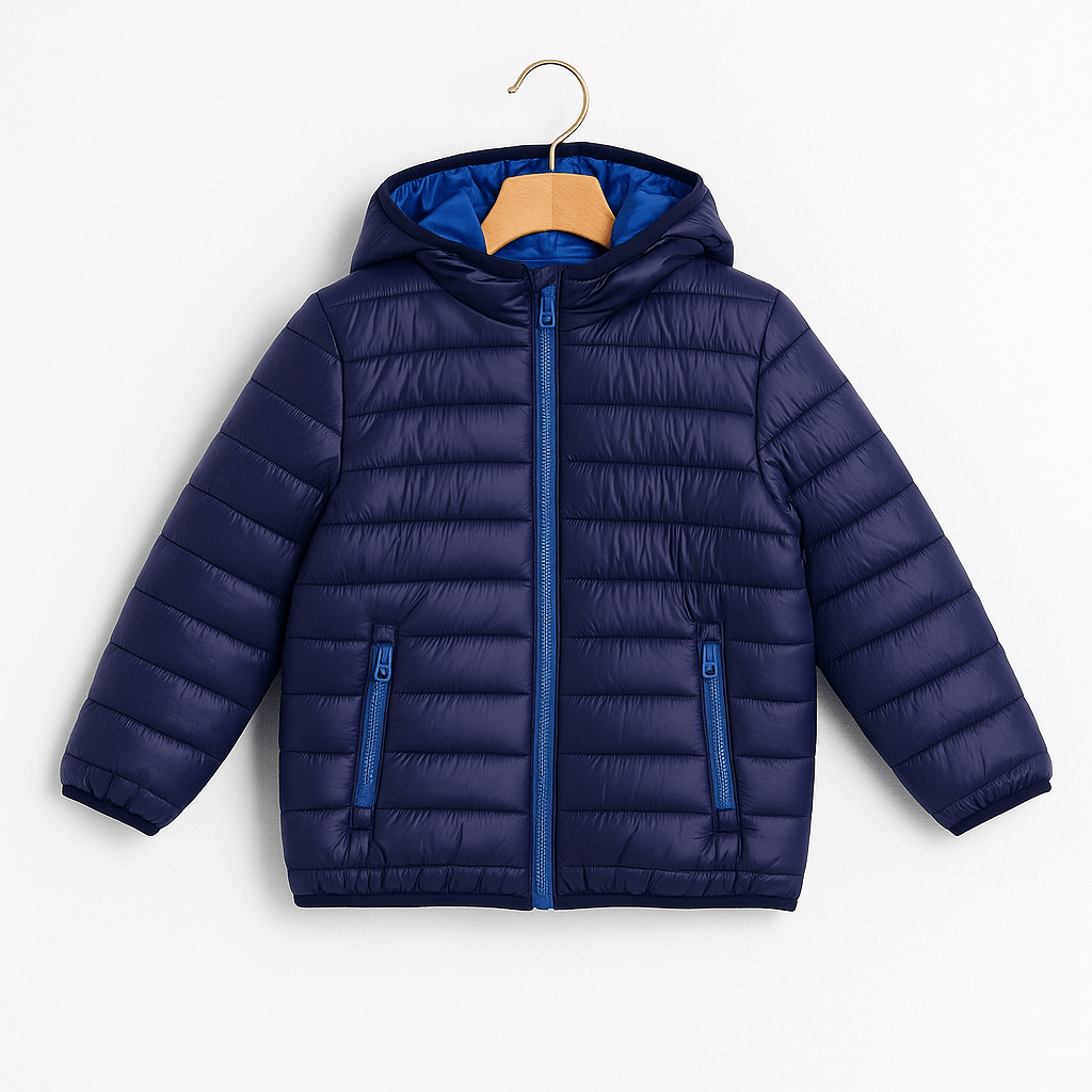 Giubbotto bimbo imbottito, con cappuccio e chiusura frontale a zip. Dotato di tasche laterali con zip e polsini elasticizzati per una migliore aderenza. Modello caldo e confortevole, ideale per la stagione invernale.