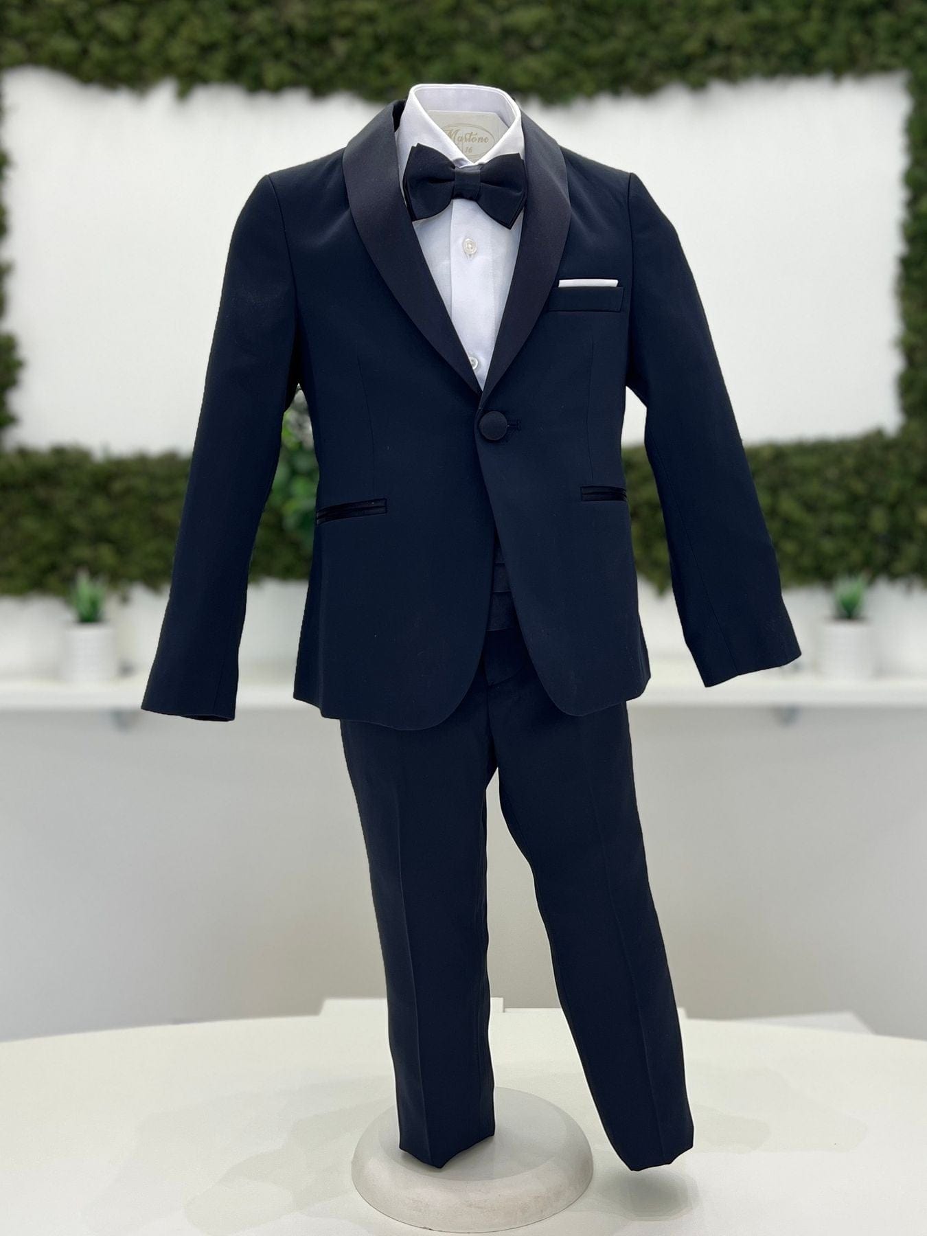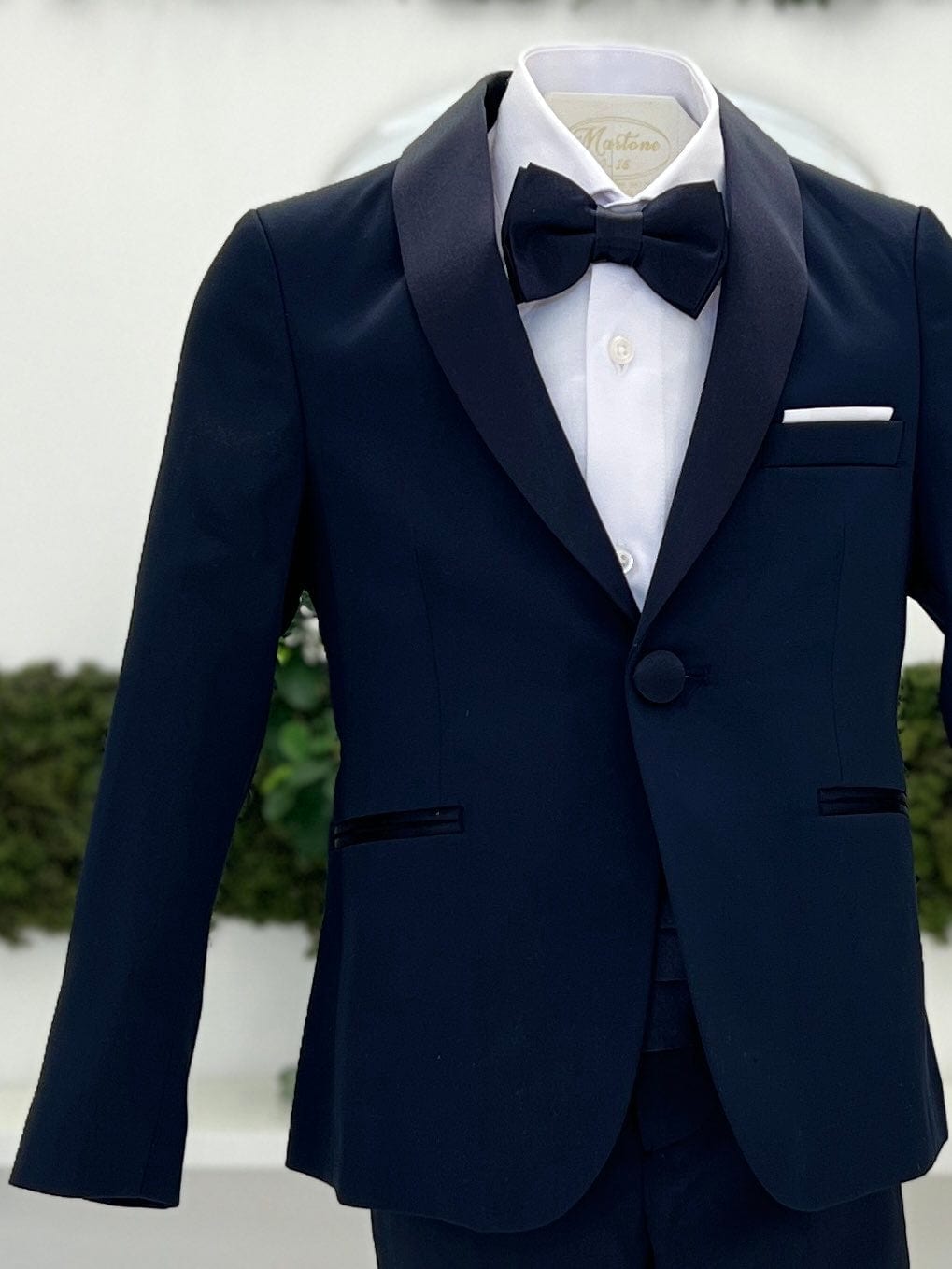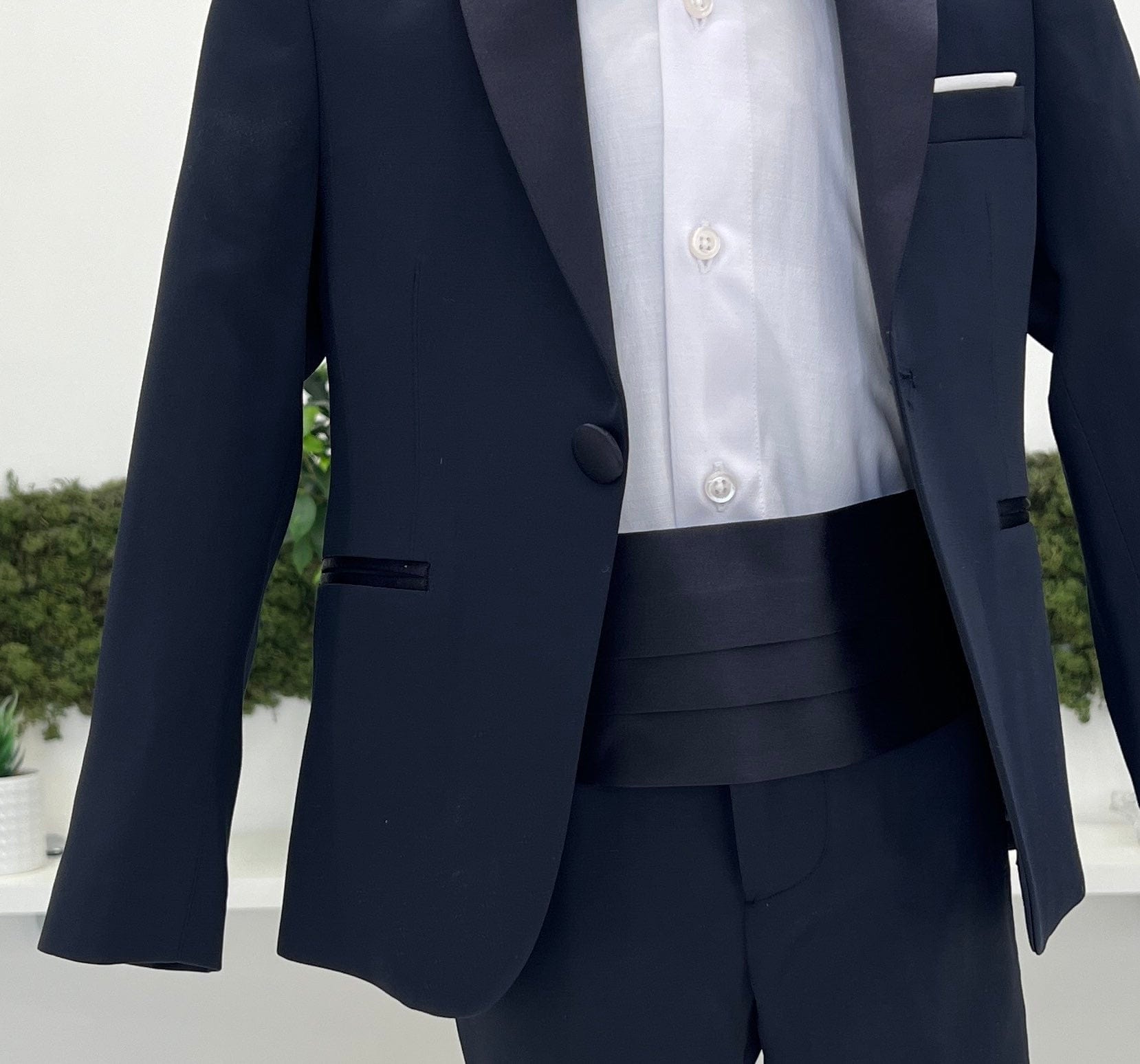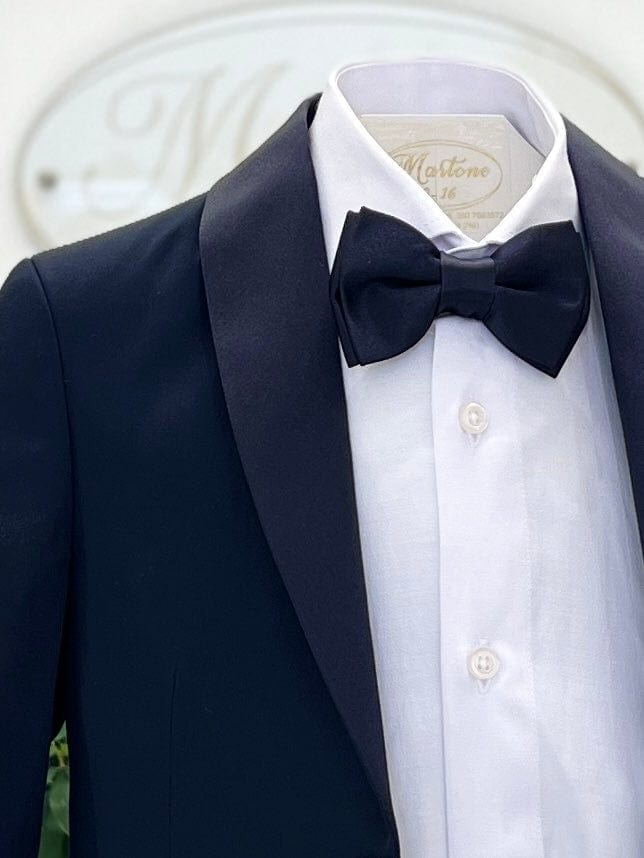 Abito smoking bimbo, composto da giacca con reverì in tessuto lucido, pantalone slim fit, fascia smoking in tessuto lucido in vita e camicia classica in cotone, con papillon coordinato.