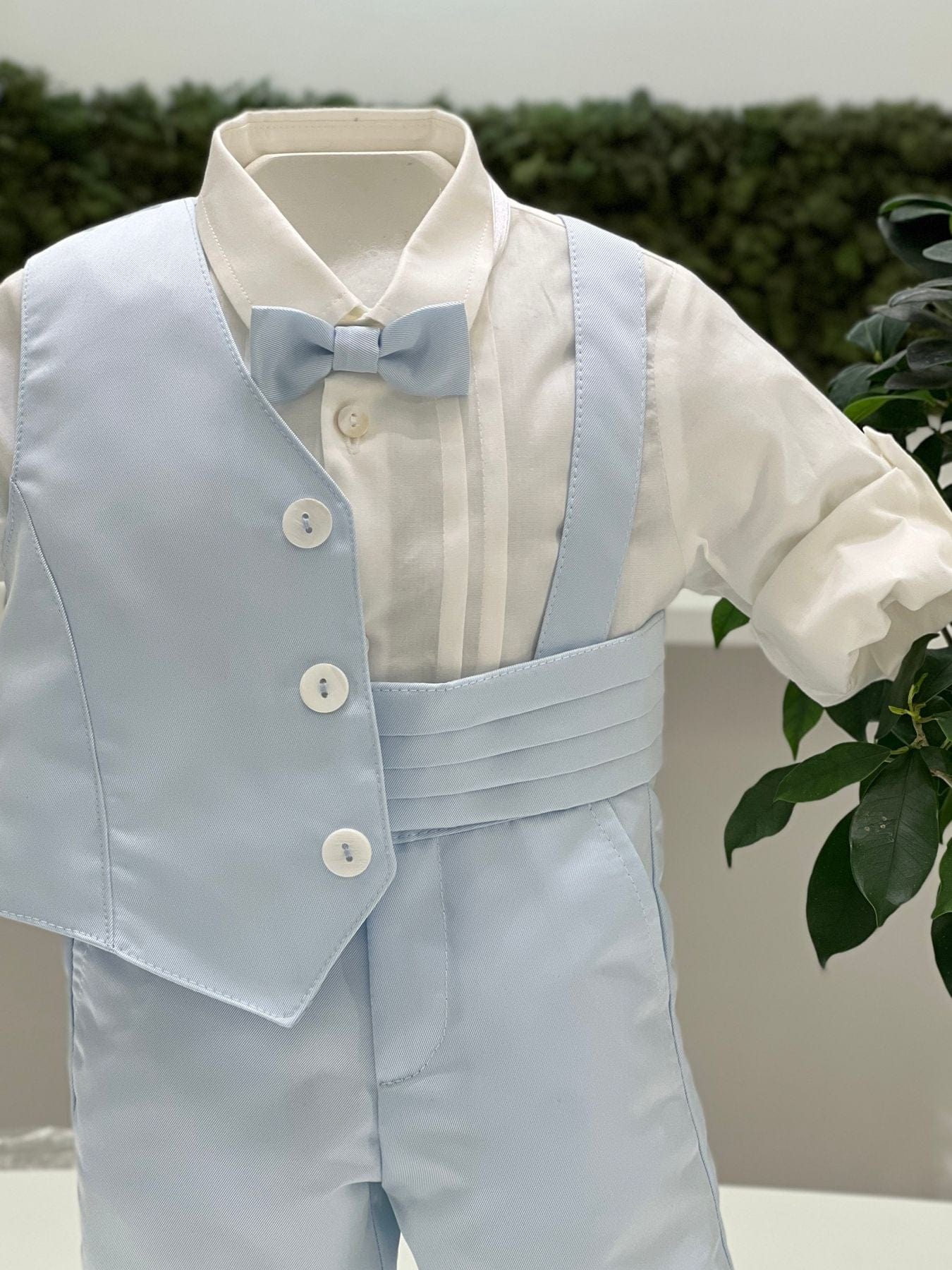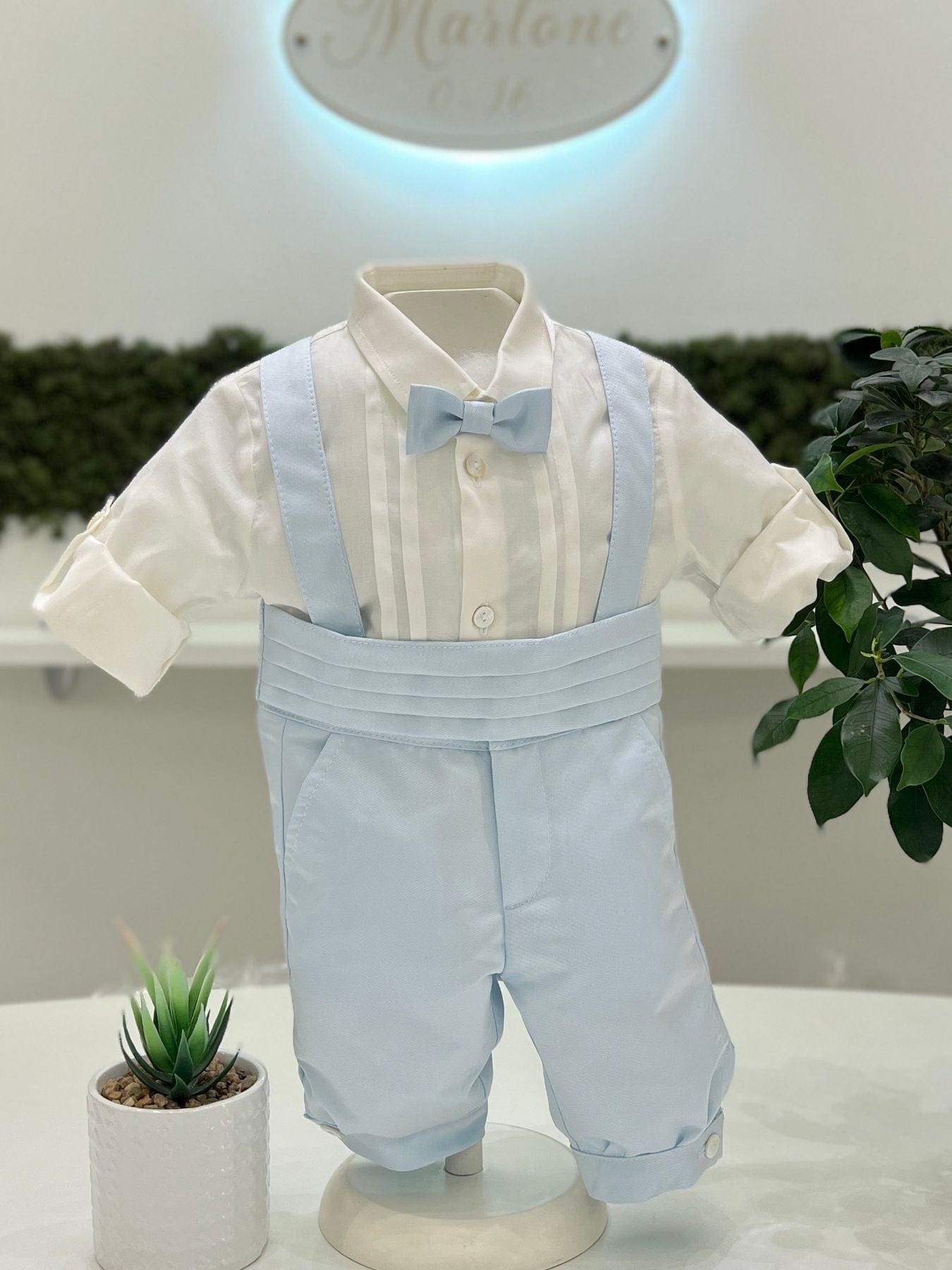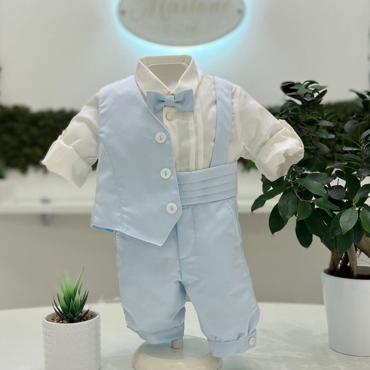 Abito battesimale composto da camicia in cotone con pieghe frontali, gilet e papillon in taffetà in seta, pantalone alla zuava con bretella in taffetà di seta.