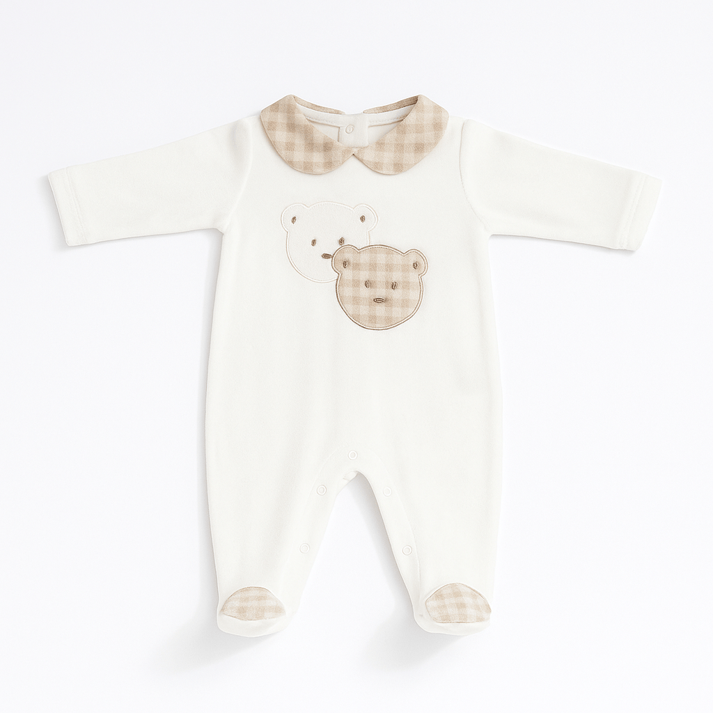 Tutina in ciniglia avorio con colletto quadrettato, applicazioni orsetto frontali, maniche lunghe e piedini coordinati. Apertura posteriore e al cavallo con bottoni a pressione.