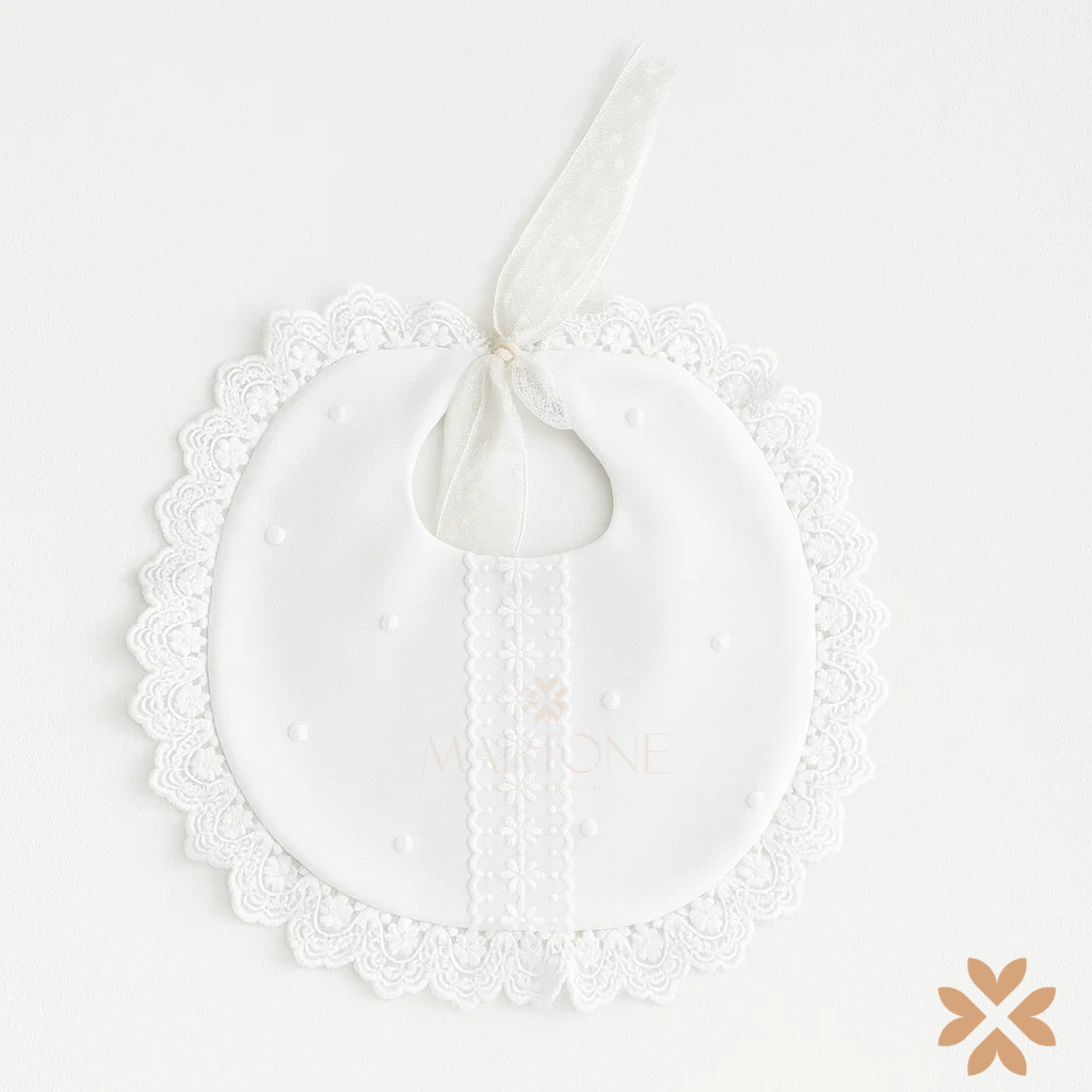Bavetta elegante battesimale o da cerimonia, realizzata in elegante tulle plumetis, con smerlo ricamato in pizzo, rifiniture in organza.