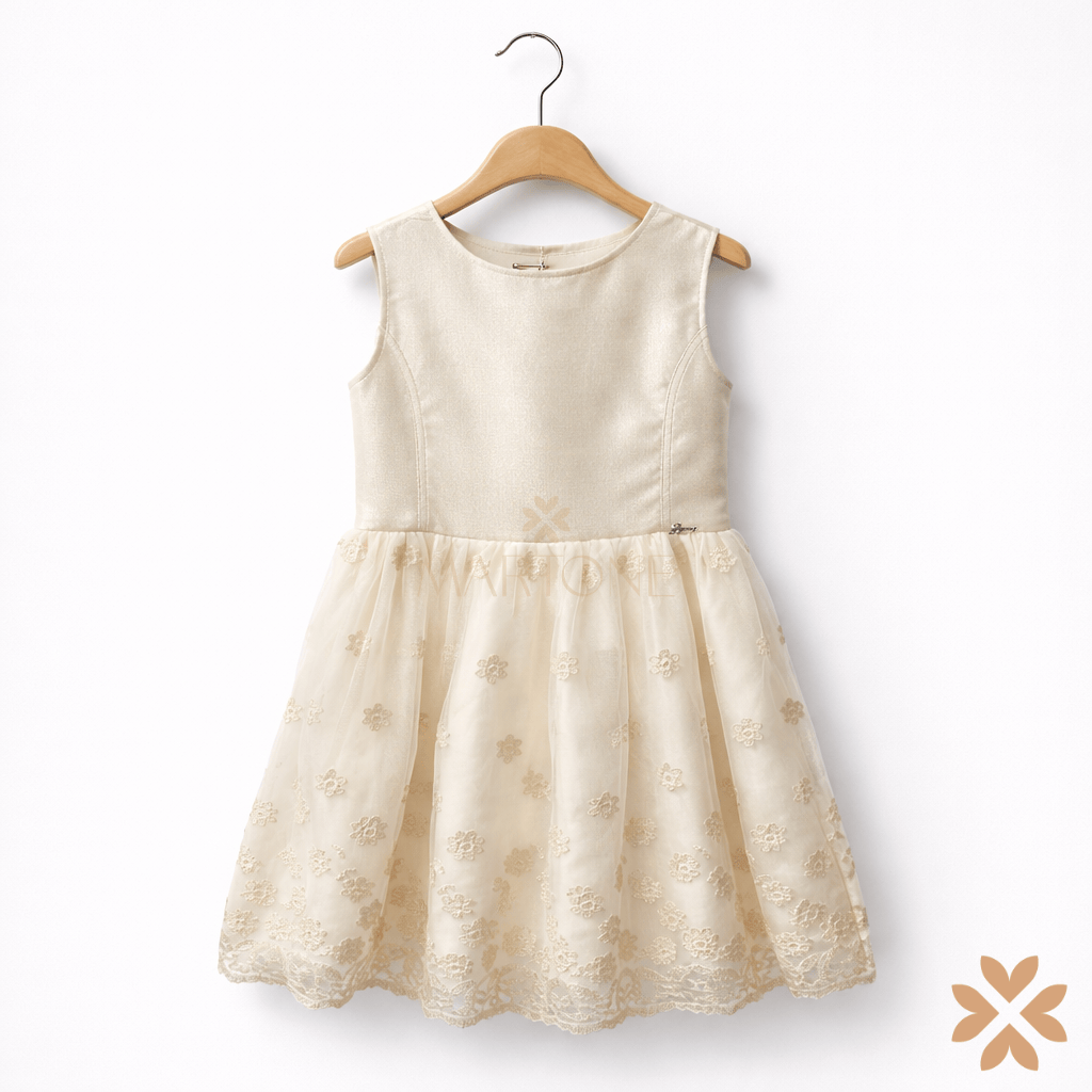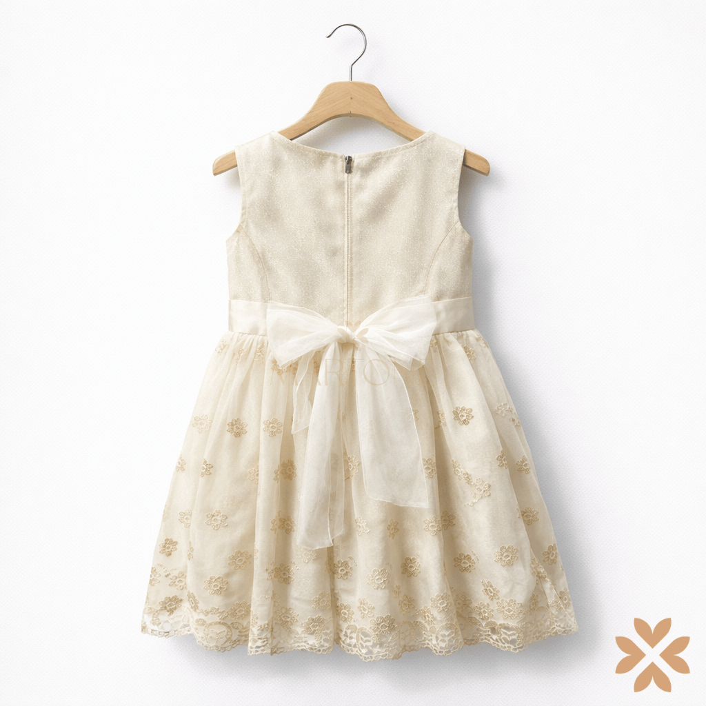 Abito da cerimonia per bambina in tonalità avorio con riflessi dorati. Corpino senza maniche in tessuto satinato leggermente luminoso, con scollo rotondo e chiusura posteriore tramite zip e bottone. Vita segnata da taglio orizzontale. Gonna realizzata in tulle ricamato con motivi floreali tono su tono e filo dorato, con orlo smerlato. Presente sottogonna per sostenere il volume. Sul retro, fiocco in tulle coordinato applicato in vita.
