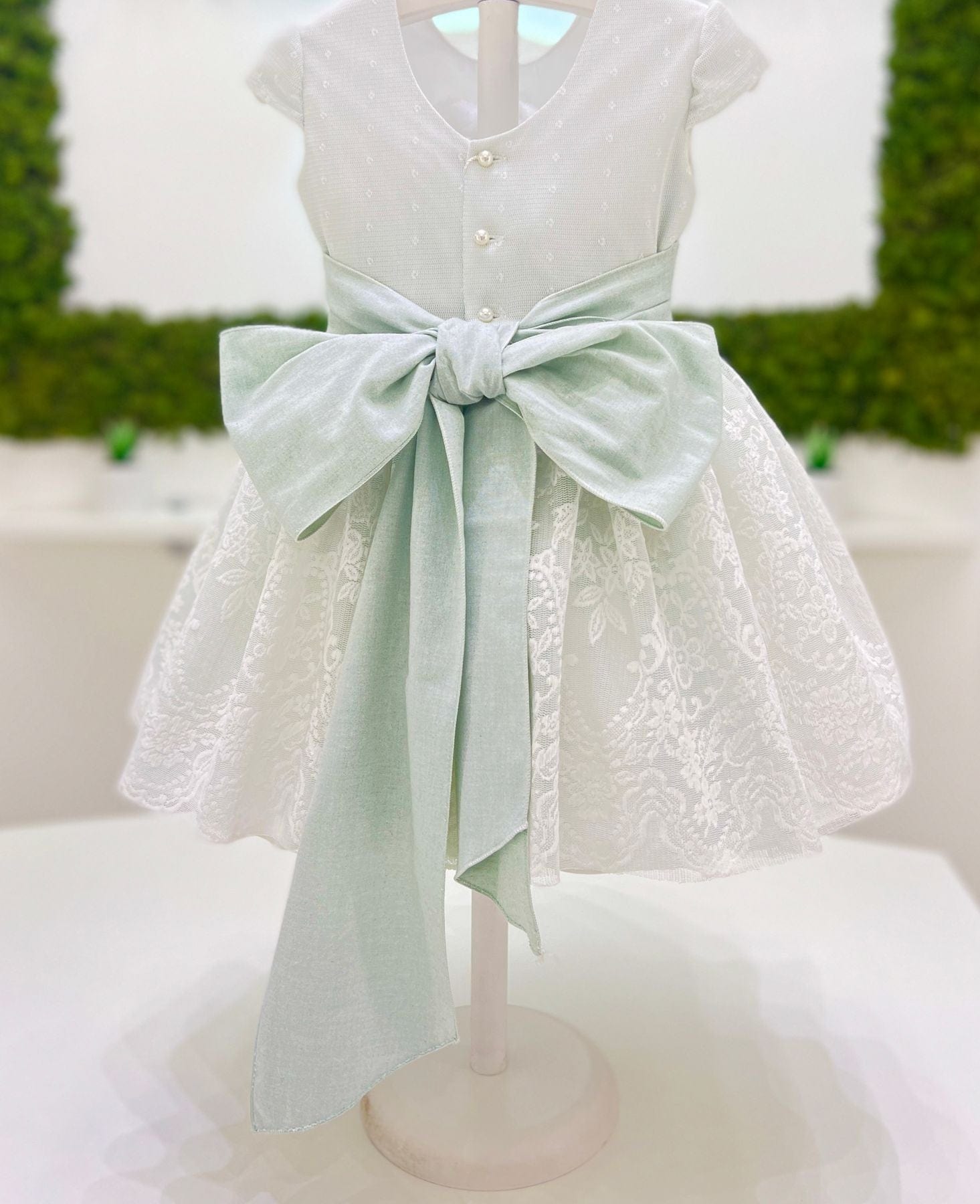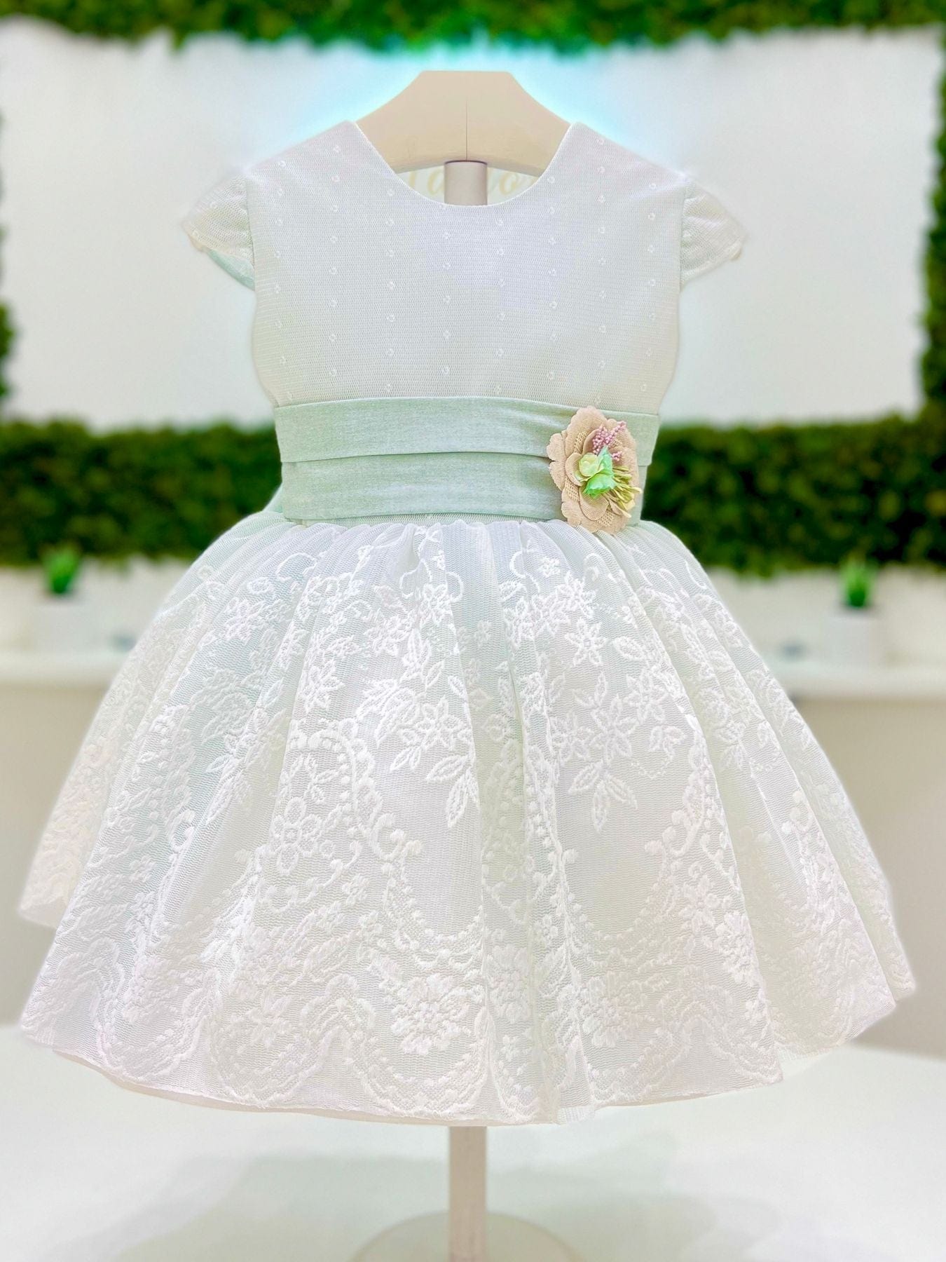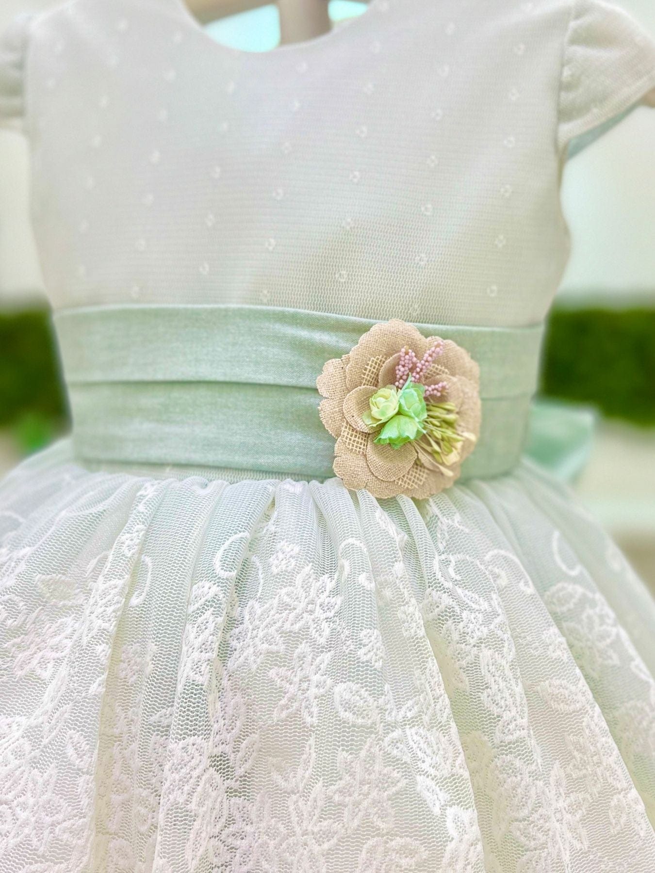Abito da cerimonia in tulle ricamato in pizzo, cintura in vita in shantung in lino con decorazione floreale e fiocco.