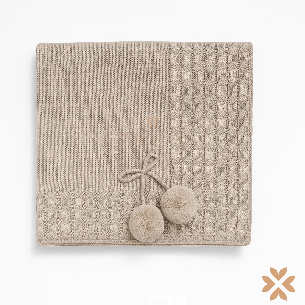 Coperta in maglia con bordatura intrecciata e pompon agli angoli. Soffice e raffinata, ideale per avvolgere il neonato con calore e stile.