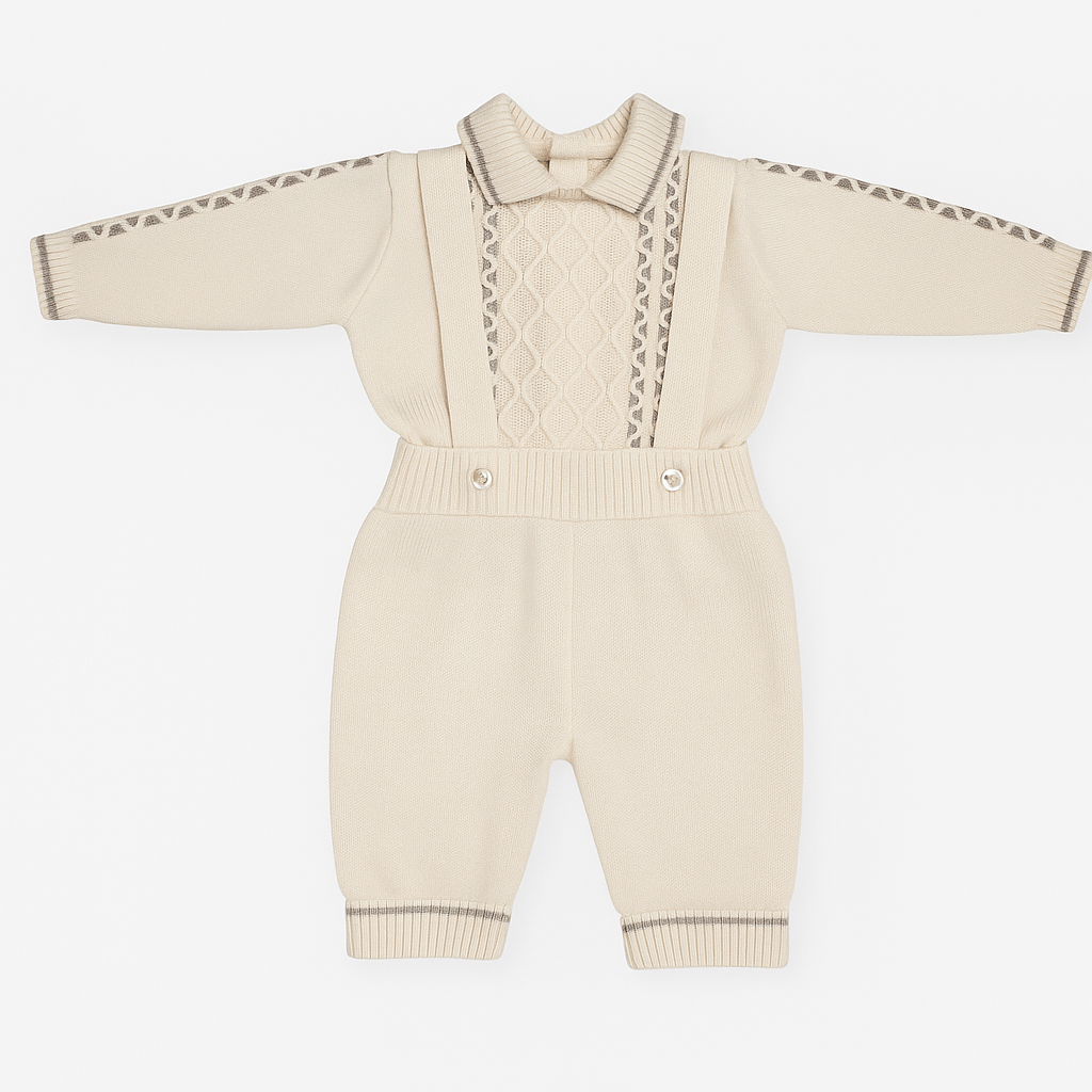 Completo in maglia per neonato in tonalità panna, caratterizzato da uno stile elegante e ricercato. La parte superiore presenta un colletto lavorato, motivo treccia centrale e inserti laterali con pattern geometrico a contrasto. Le bretelle integrate, anch’esse in maglia, arricchiscono il design e si uniscono ai pantaloni attraverso due bottoni decorativi. Il pantalone è a gamba lunga con polsini elasticizzati rifiniti da righe in contrasto. Un coordinato raffinato e confortevole, ideale per cerimonie e occasioni speciali.