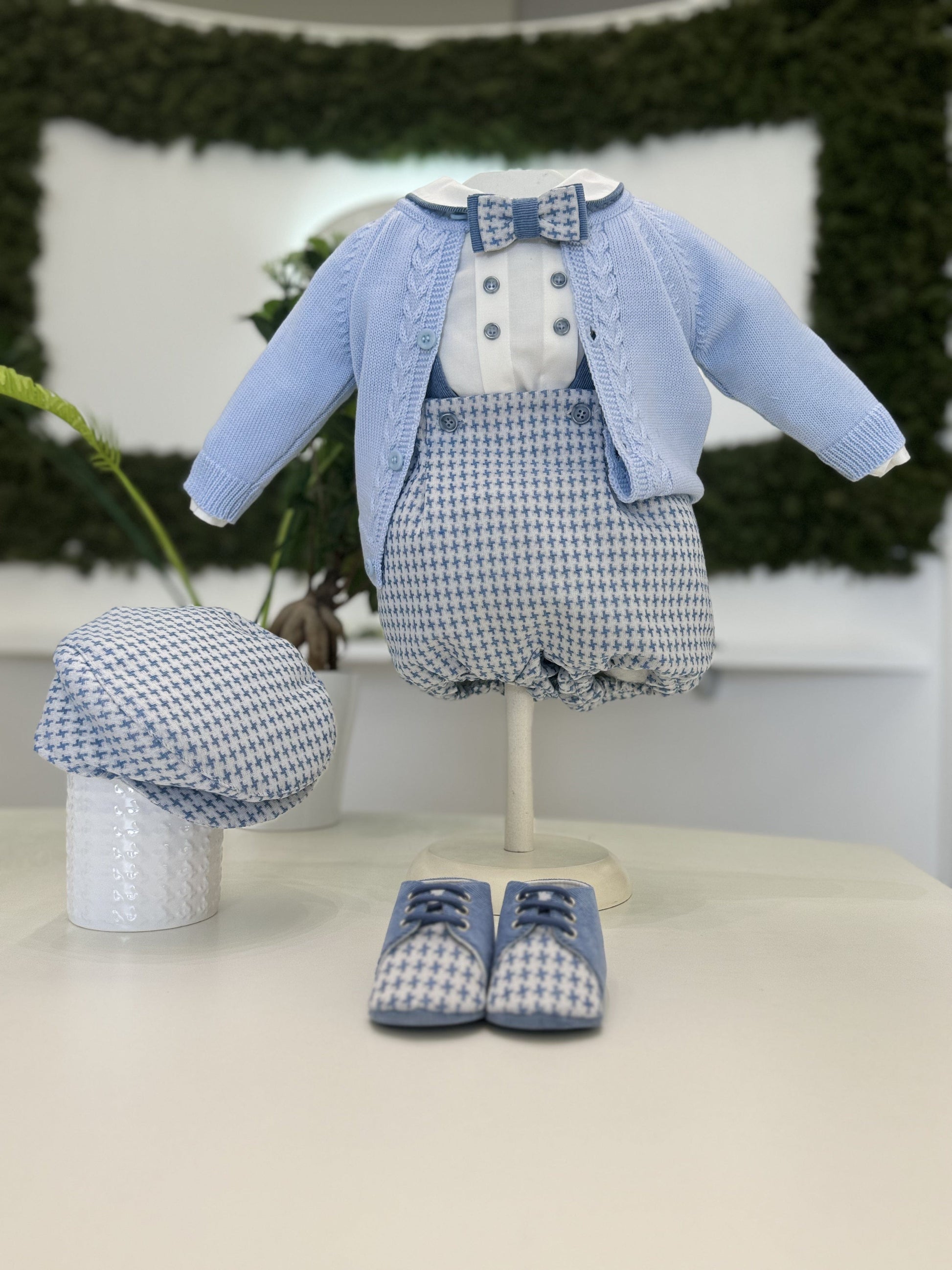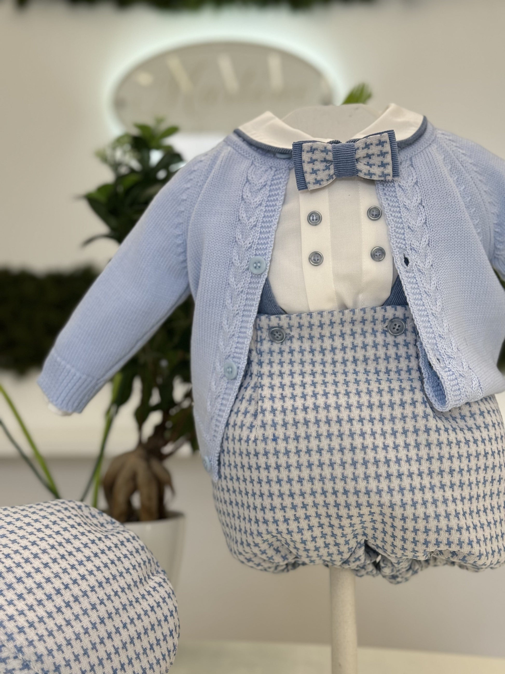 Completo battesimale quattro pezzi composto da pagliaccetto in tessuto operato e bretelle in velluto rigato, cardigan in 100% lana con lavorazione a trecce, camicia doppiopetto e papillon coordinati.