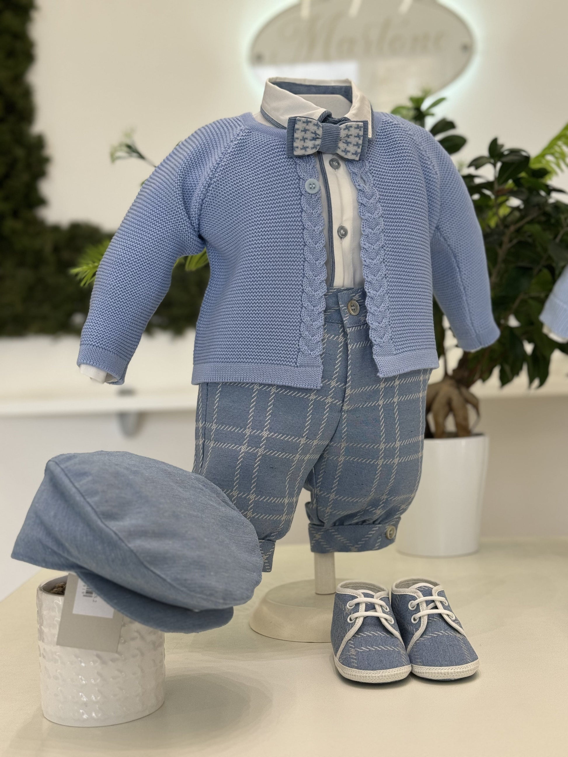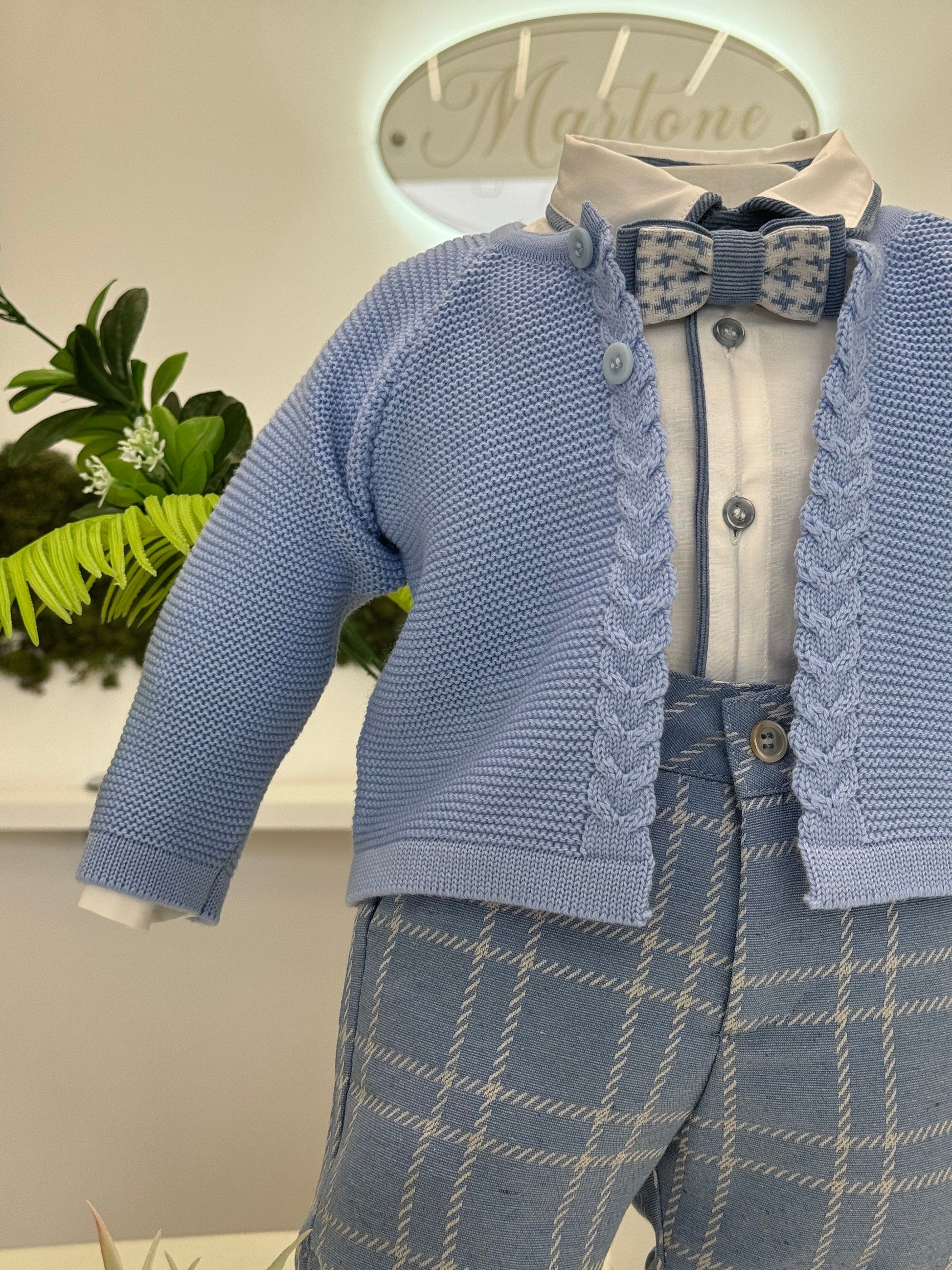 Completo battesimale composto da pantalone alla zuava a quadri, con bretelle, camicia e papillon coordinati e cardigan 100% lana con lavorazione a trecce.