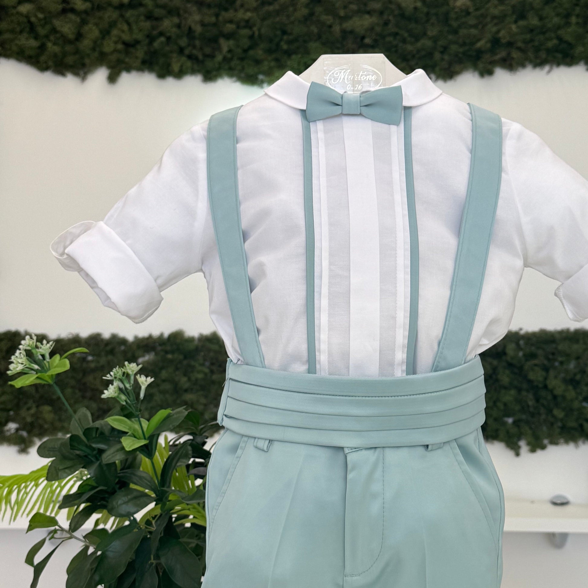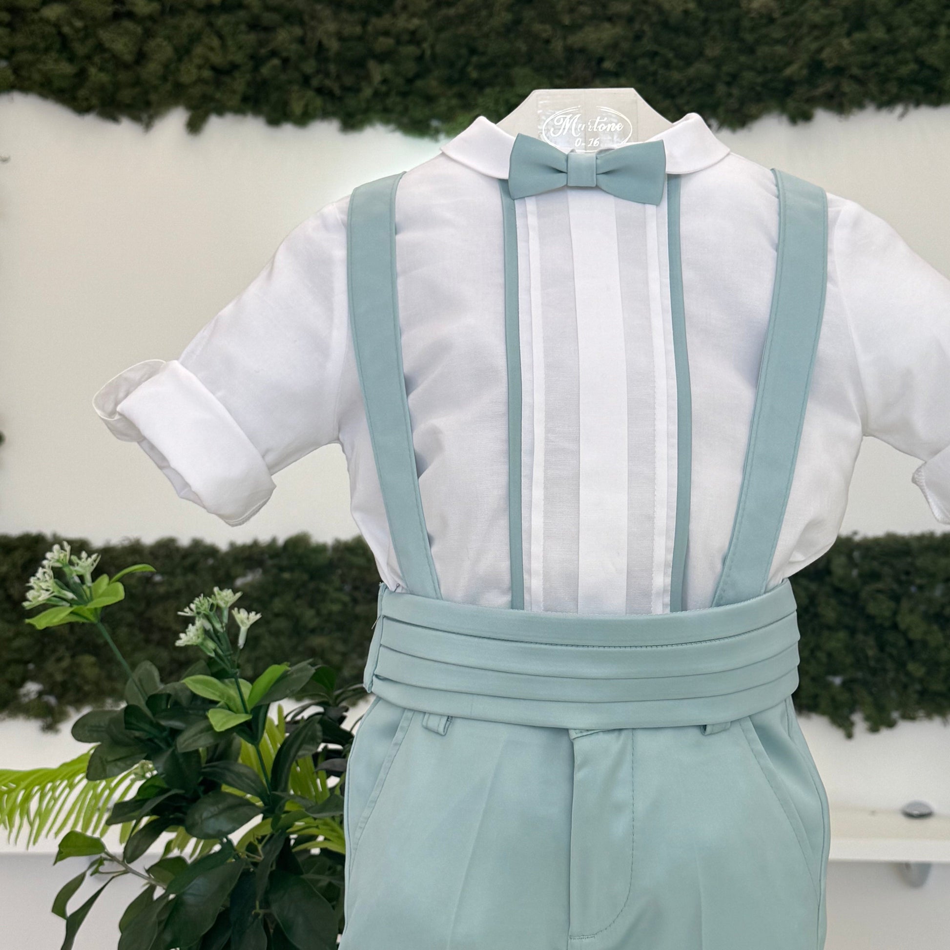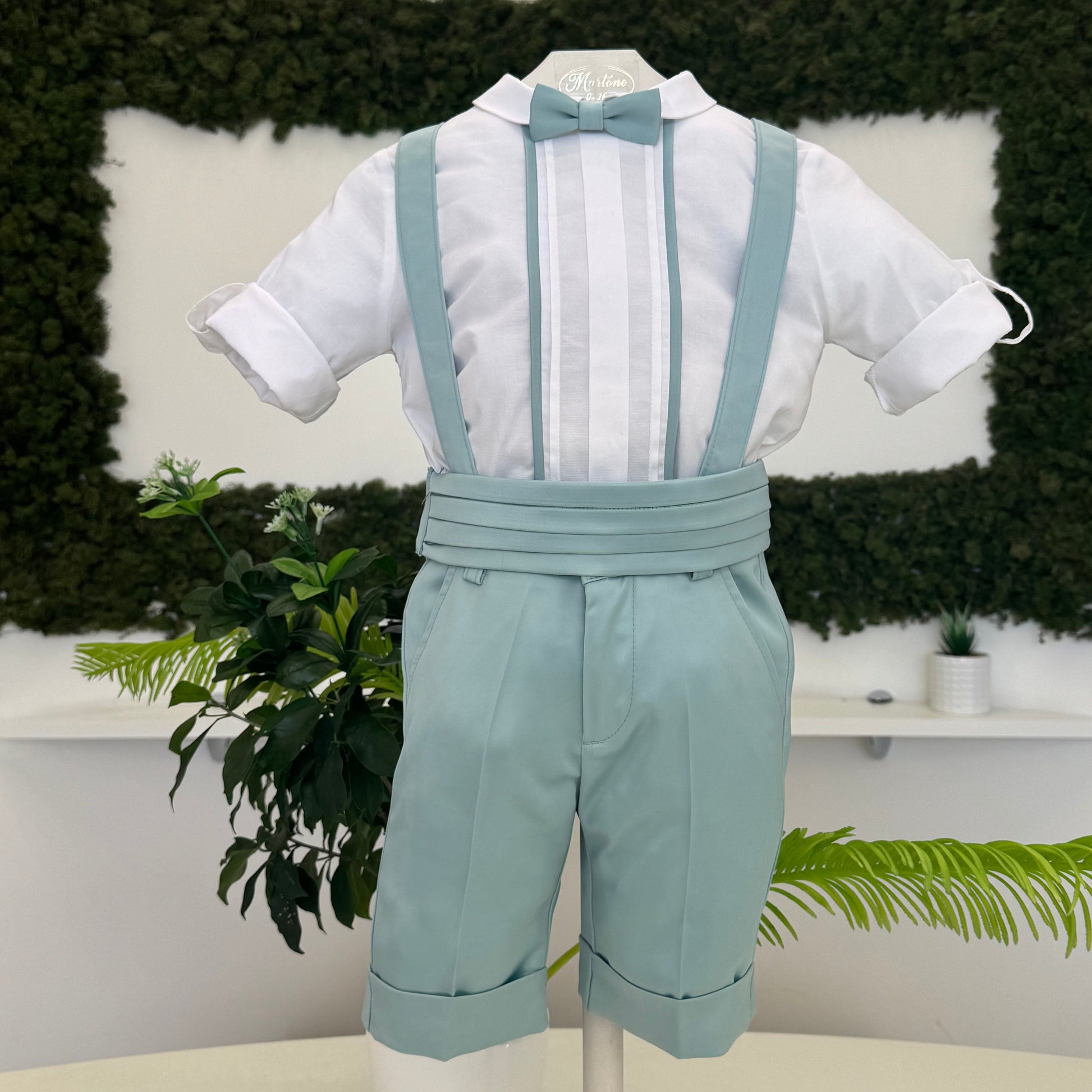 Completo elegante per bimbo in tessuto lucido, composto da pantaloncino con bretelle e fascia in vita, che conferiscono un tocco di classe. La camicia in cotone con pieghe e il papillon coordinato completano l'outfit, creando un look raffinato e perfetto per le cerimonie speciali.