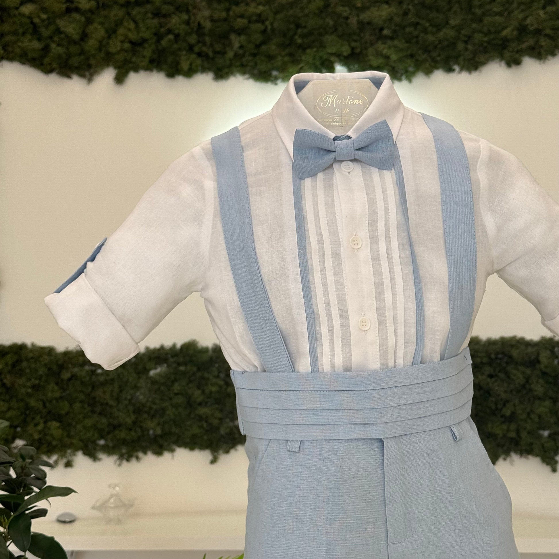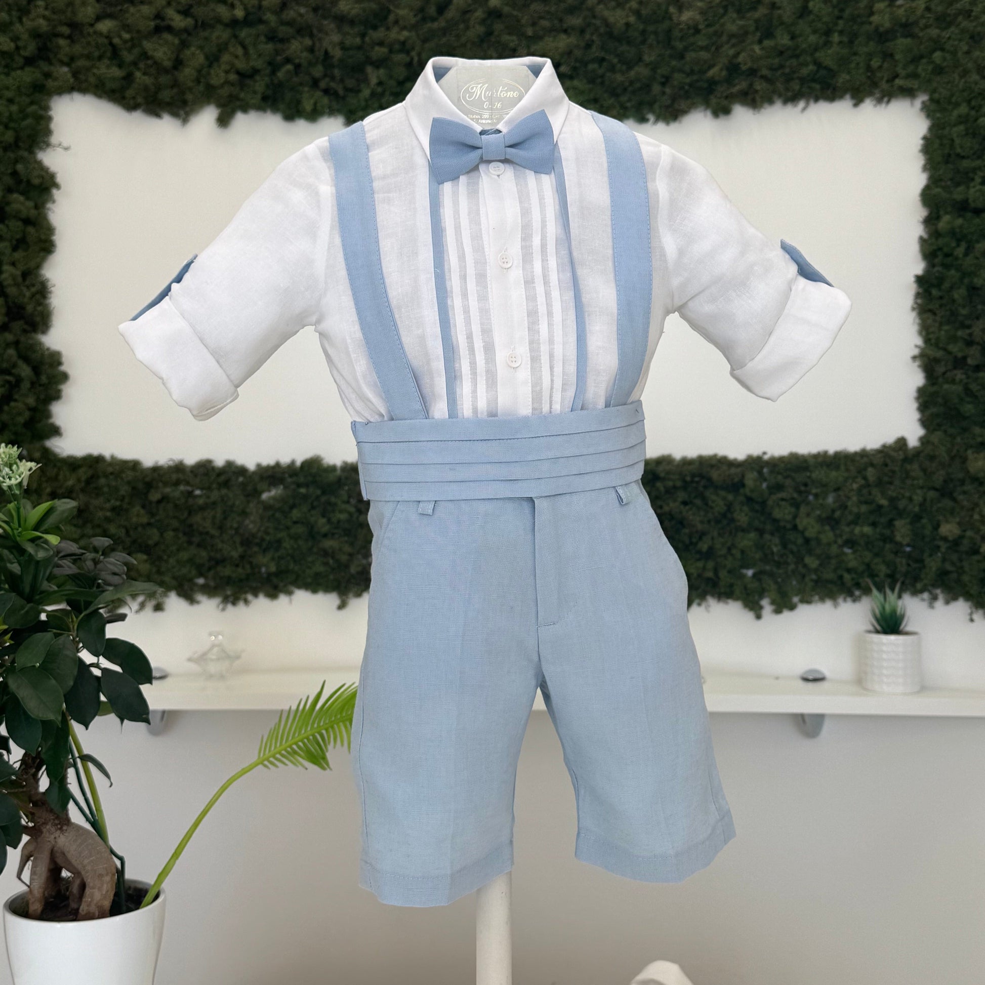 Completo elegante per bimbo in lino, composto da pantaloncino con bretelle e fascia in vita, per un look raffinato e confortevole. La camicia con pieghe e il papillon coordinato completano l'outfit, creando un insieme sofisticato e perfetto per le cerimonie più importanti.