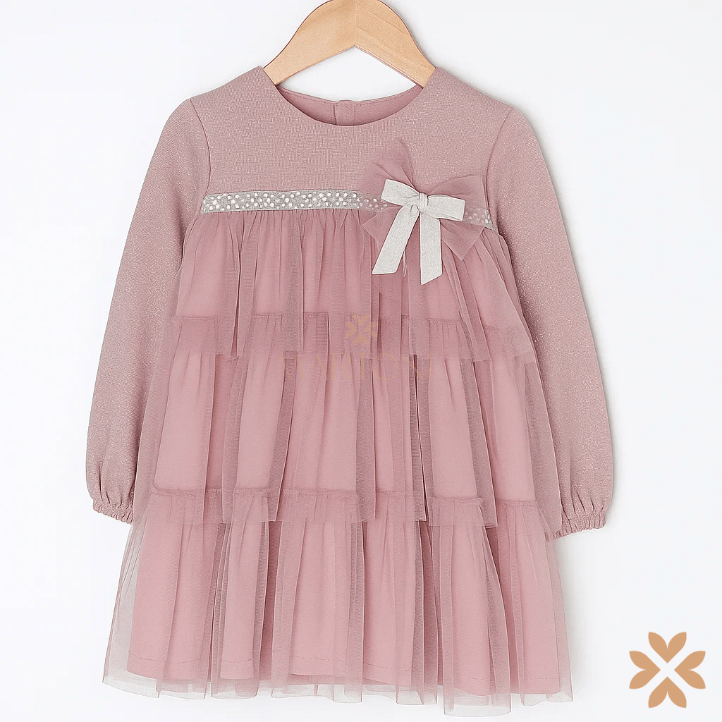 Abito per bambina in rosa con corpetto in lurex e gonna in tulle a balze, arricchito da applicazione di fiocco sul davanti e sul retro, ideale per cerimonie e occasioni speciali.