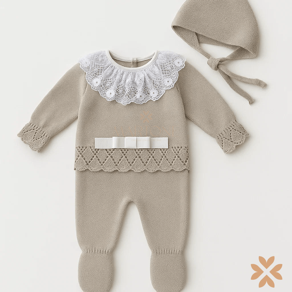 Tutina in maglia rosa con colletto in pizzo lavorato e fiocco in raso applicato sul davanti. Rifinita con dettagli traforati e piedini integrati, è completata da cuffia abbinata. Un coordinato elegante e delicato, perfetto per i primi mesi della tua piccola.