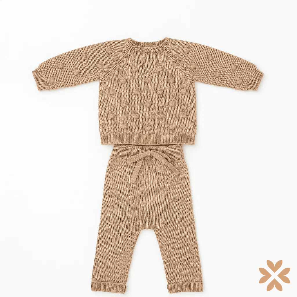 Completo neonato in maglia beige con lavorazione a nodini. Maglioncino a girocollo con maniche lunghe e motivo tridimensionale, pantalone coordinato con risvolto e laccetto decorativo in vita. Realizzato in filato morbido per garantire comfort e libertà di movimento.