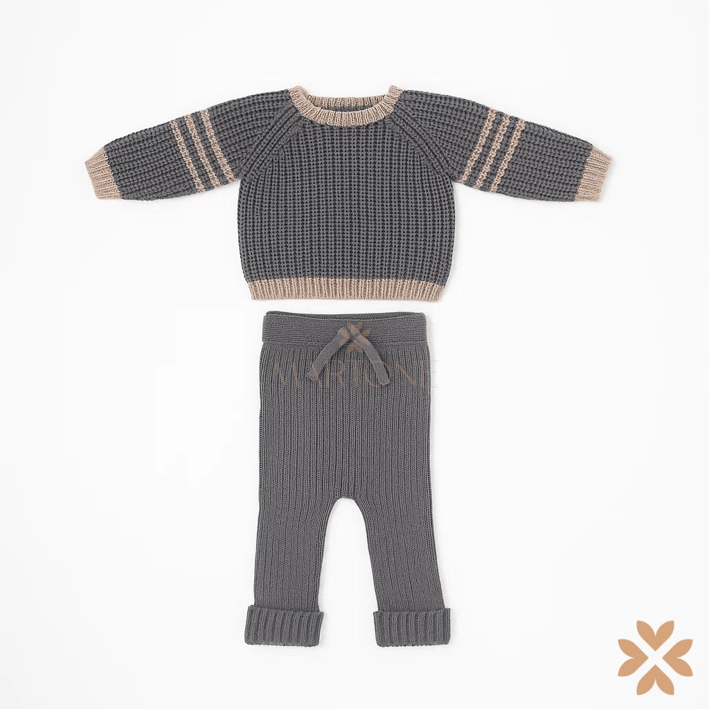 Completo neonato in maglia grigio con dettagli panna. Maglioncino a girocollo con maniche lunghe e bordi a contrasto, pantalone coordinato con coulisse in vita. Realizzato in filato morbido per garantire comfort e libertà di movimento.
