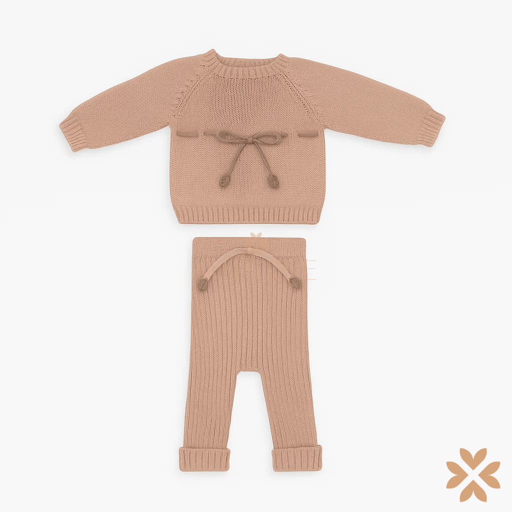 Completo neonato in maglia beige con passanastri e fiocchetto decorativo. Maglioncino a girocollo con maniche lunghe e lavorazione traforata sul punto vita, pantalone coordinato con laccetto estetico e risvolto alla caviglia. Realizzato in filato morbido per garantire comfort e libertà di movimento.