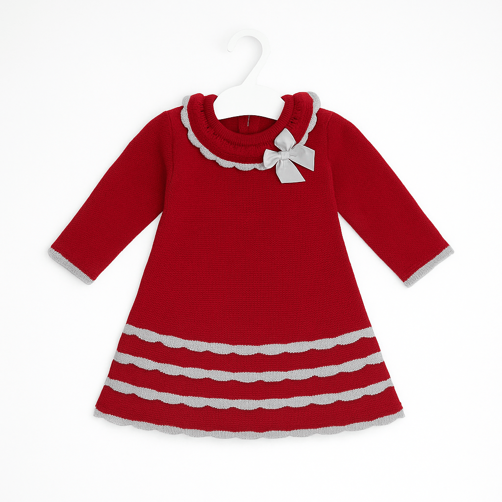 Abito in maglia rosso con balze grigie e fiocco laterale. Linea pulita e decisa, perfetta per le feste.