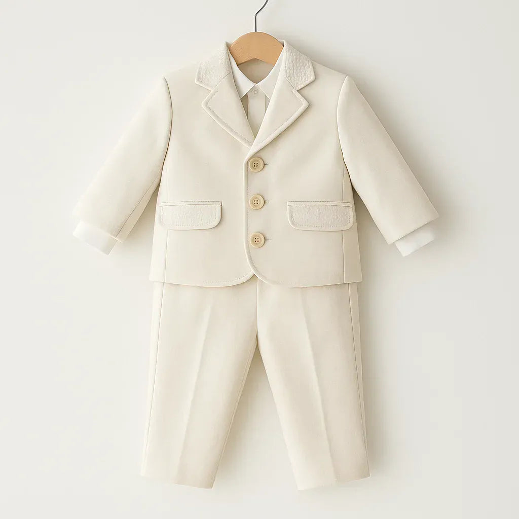 Completo elegante per neonato composto da camicia con colletto classico e giacca panna con rever lavorato, taschini con pattina e bottoni in tinta. I pantaloni coordinati, con piega centrale e linea pulita, completano l’insieme con un’eleganza essenziale e impeccabile. Un look raffinato, ideale per cerimonie e occasioni speciali.