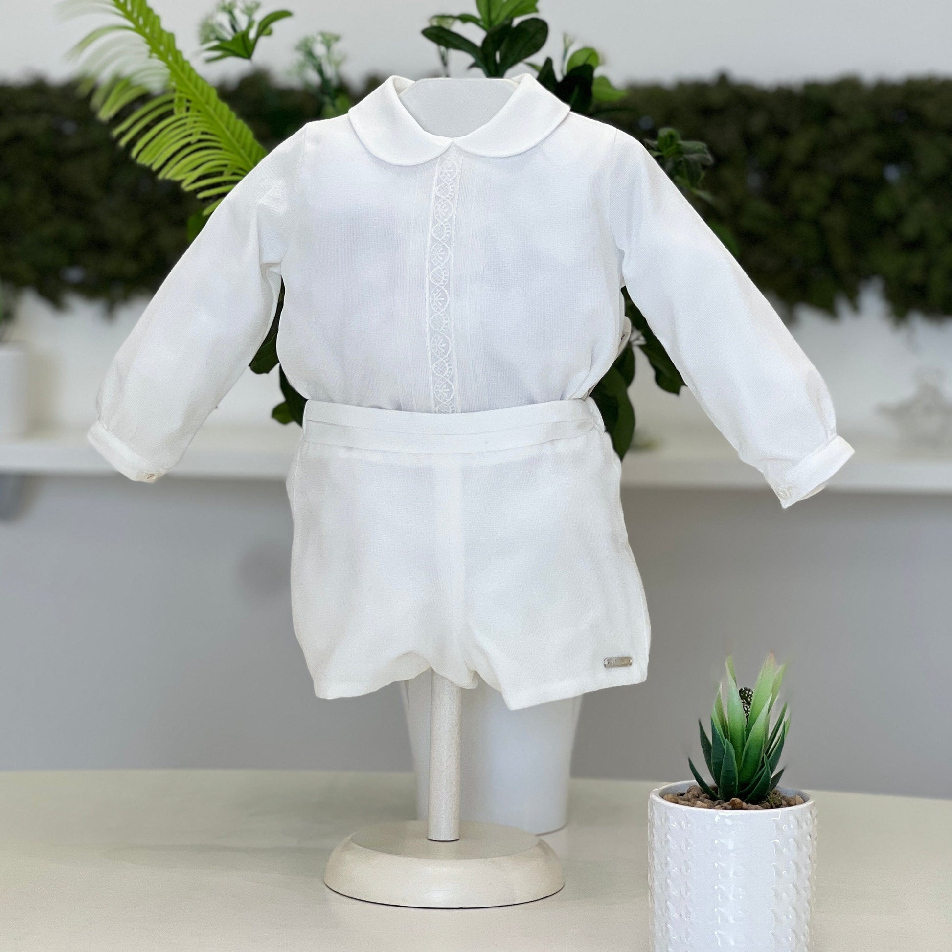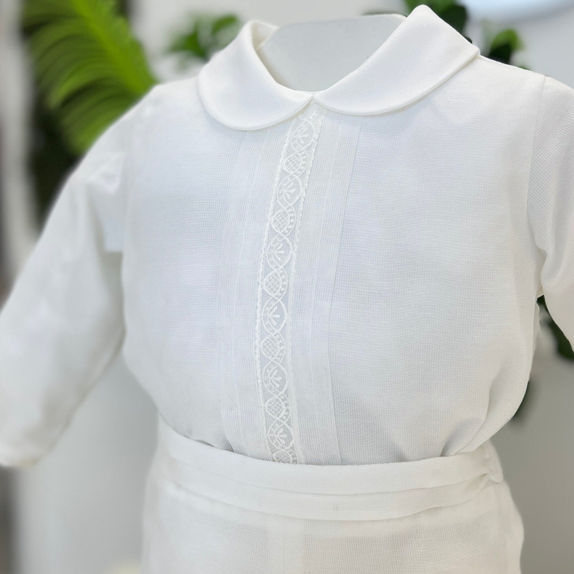 Completo battesimale in stile classico, realizzato in organza con effetto seta e impreziosito da ricami realizzati a mano. La camicia presenta un colletto tondo e un inserto centrale ricamato tono su tono, mentre gli short con fascia in vita completano l’insieme con equilibrio e pulizia estetica. Un capo di alta raffinatezza, pensato per cerimonie che richiedono eleganza autentica e cura artigianale.