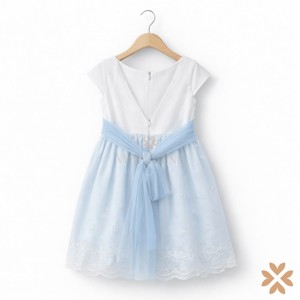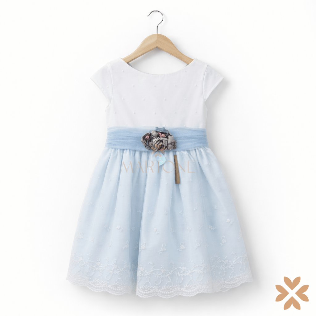 Abito per bambina in tessuto bianco dalla linea pulita ed elegante. Corpino essenziale con maniche corte rifinite e scollo delicato. Vita definita da fascia in tulle azzurro con applicazione floreale sul davanti e ampio fiocco sul retro. Gonna ampia con fondo ricamato che dona equilibrio e leggerezza al capo. Stile classico e raffinato, sobrio e senza tempo.