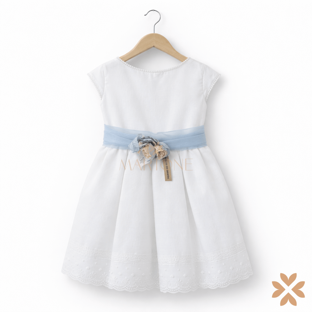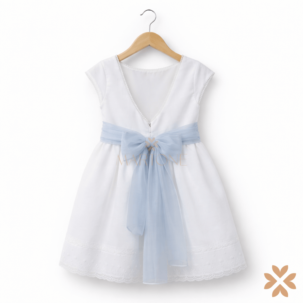 Abito per bambina in tessuto bianco dalla linea pulita ed elegante. Corpino essenziale con maniche corte rifinite e scollo delicato. Vita definita da fascia in tulle azzurro con applicazione floreale sul davanti e ampio fiocco sul retro. Gonna ampia con fondo ricamato che dona equilibrio e leggerezza al capo. Stile classico e raffinato, sobrio e senza tempo.