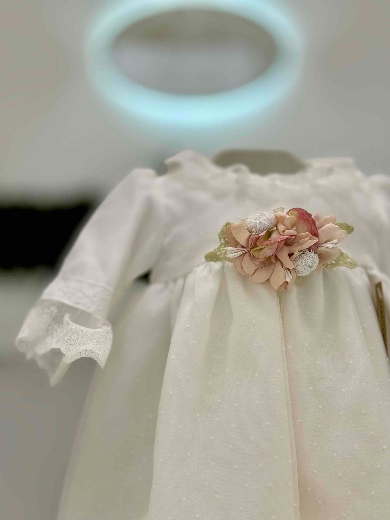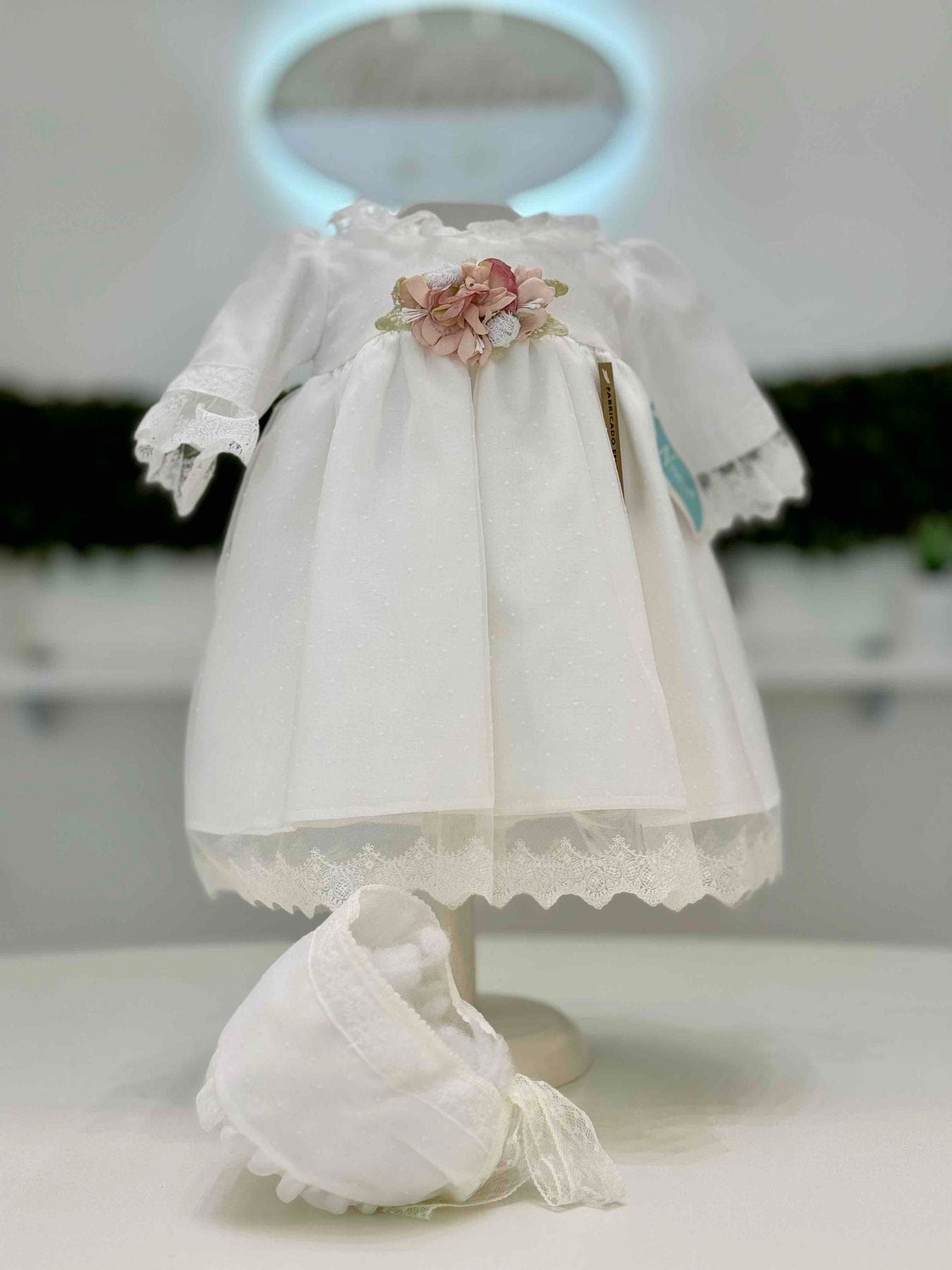 Abito battesimale con cuffia, manica lunga bordata in merletto, tessuto plumetis bordata con merletto e fiore in vita