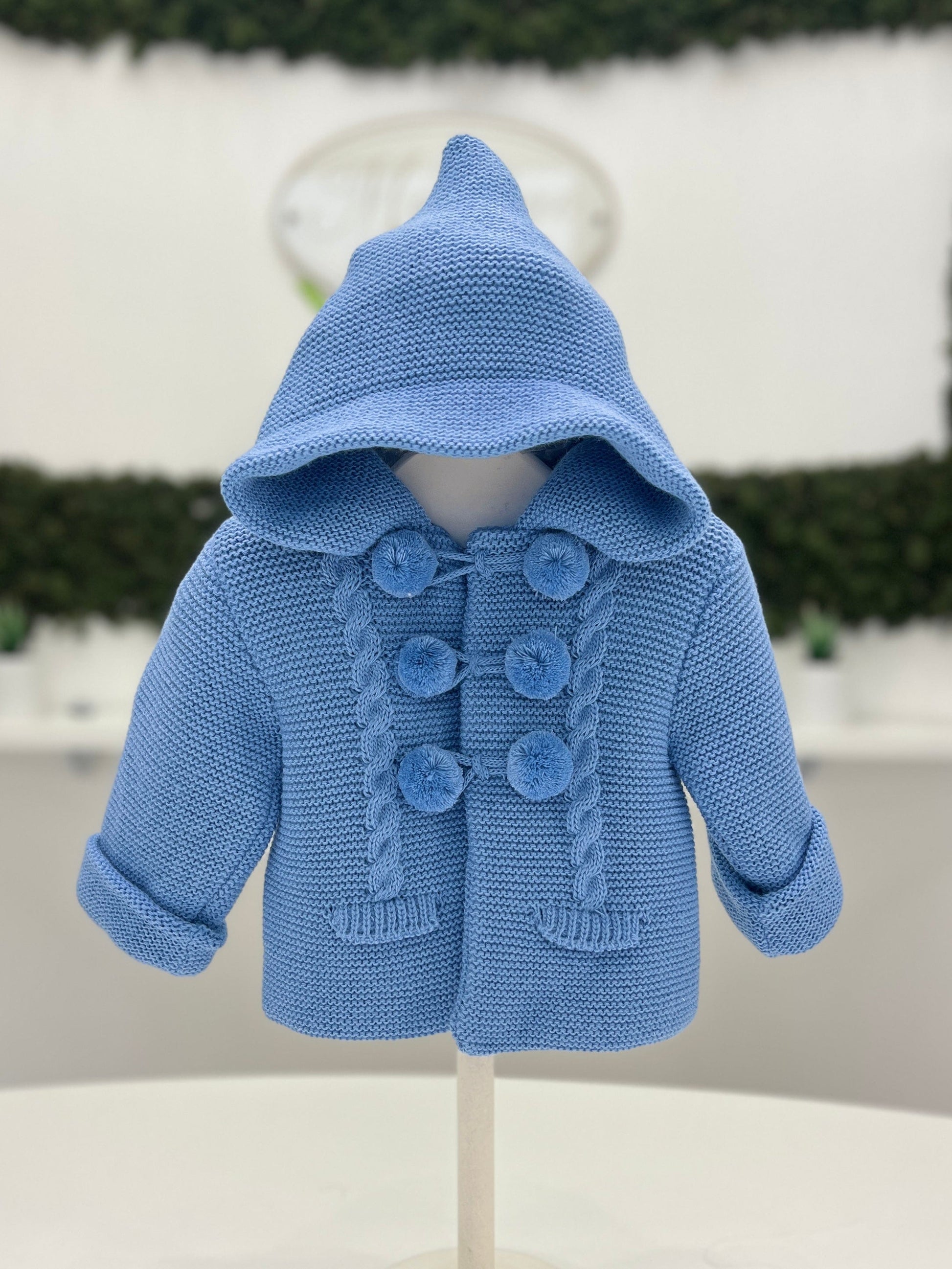 Una giacca invernale per neonato in lana sintetica con cappuccio, caratterizzata da una lavorazione a trecce sul davanti. I pompon fungono da bottoni, aggiungendo un tocco giocoso, mentre delle finte tasche sul davanti completano il design.