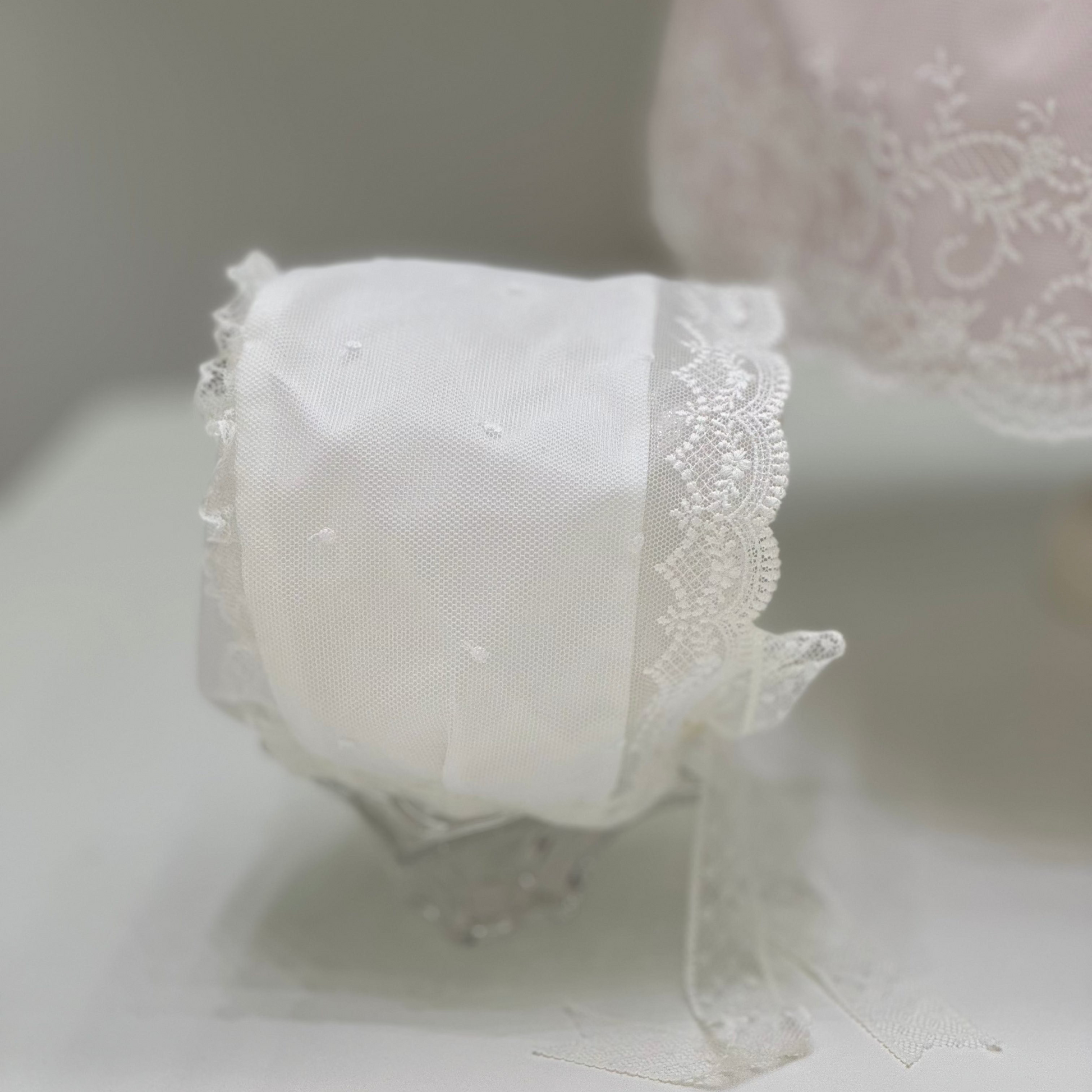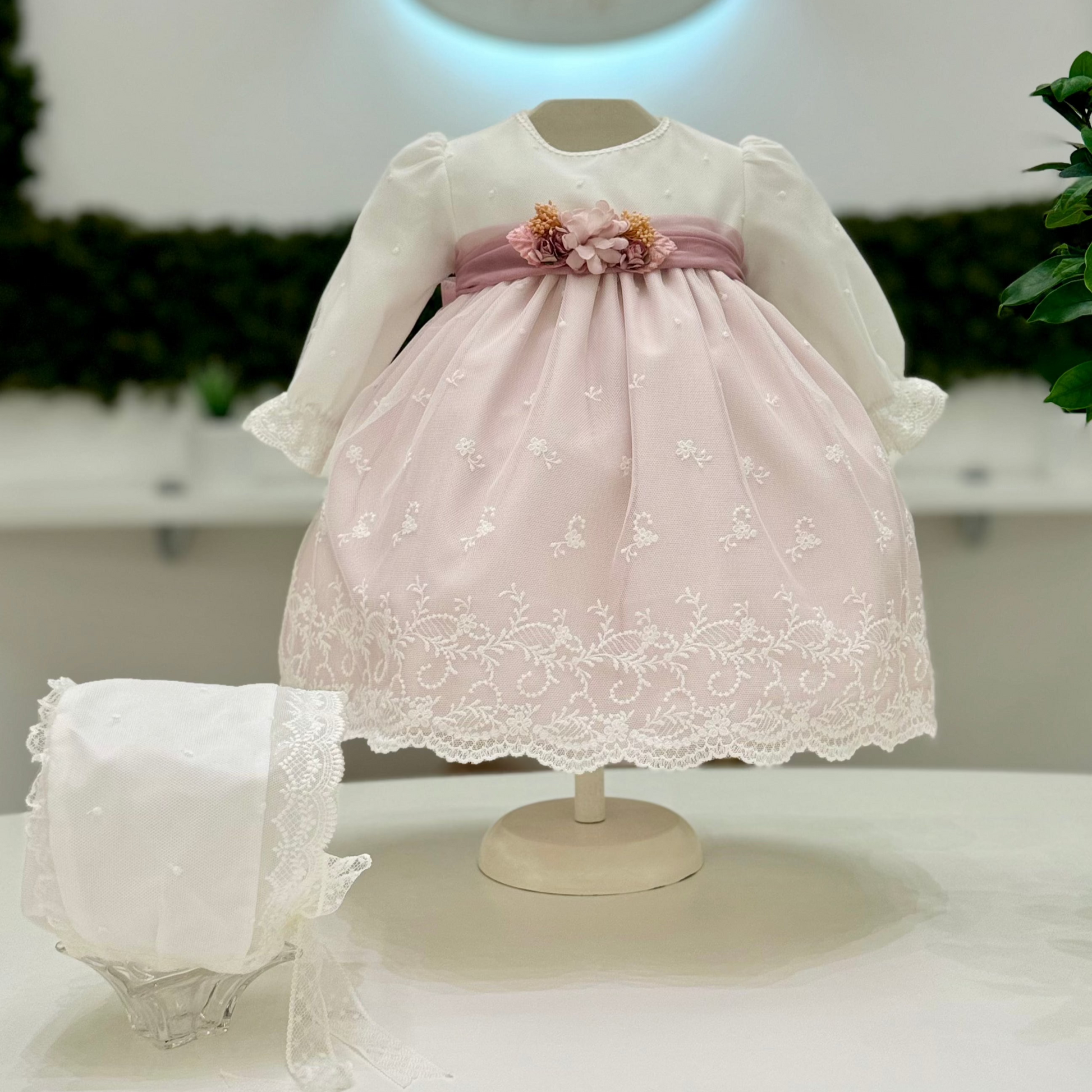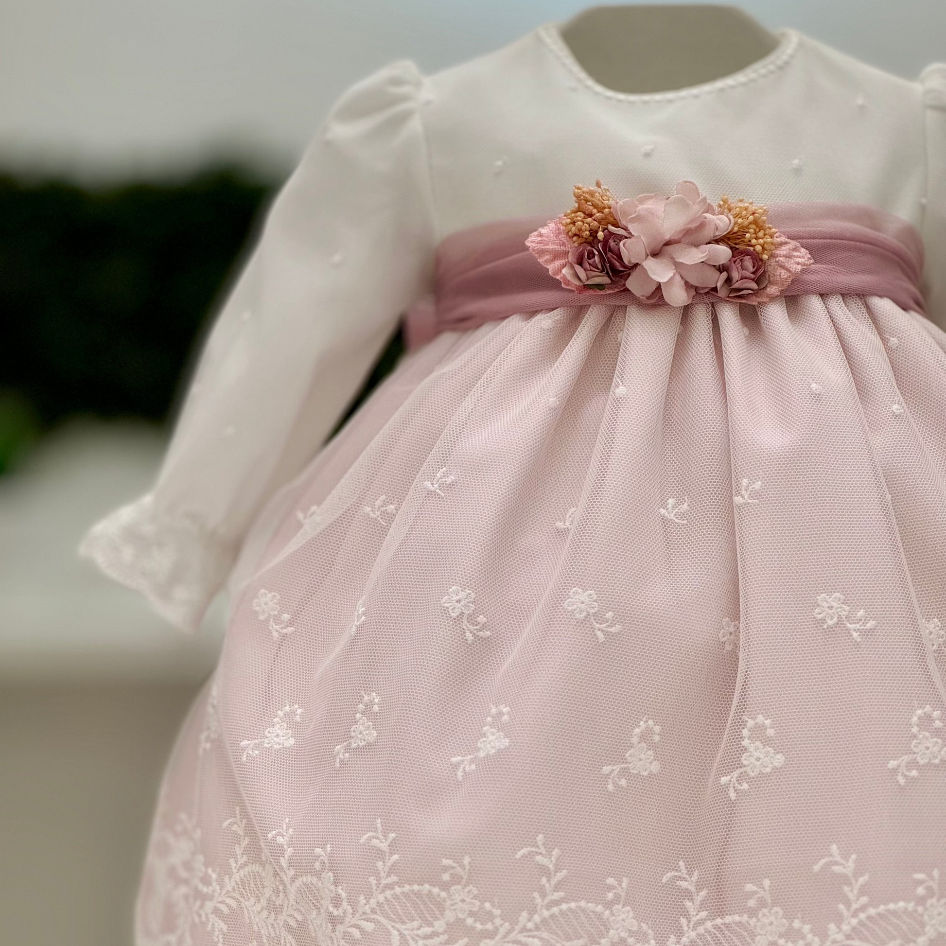 Questo abito battesimale per neonata è un vero incanto, con fondo rosa in tulle e cotone impreziosito da ricami in pizzo macramè. Il set comprende anche una cuffia e culotte coordinate, perfette per completare l'outfit. Le maniche lunghe foderate offrono comfort e calore, mentre la cintura in tulle, ornata da una spilla removibile con delicato dettaglio floreale, aggiunge un tocco di eleganza. Ideale per rendere ancora più speciale e indimenticabile il giorno del battesimo della tua piccola, questo abito unisce dolcezza e raffinatezza in un capo straordinario.
