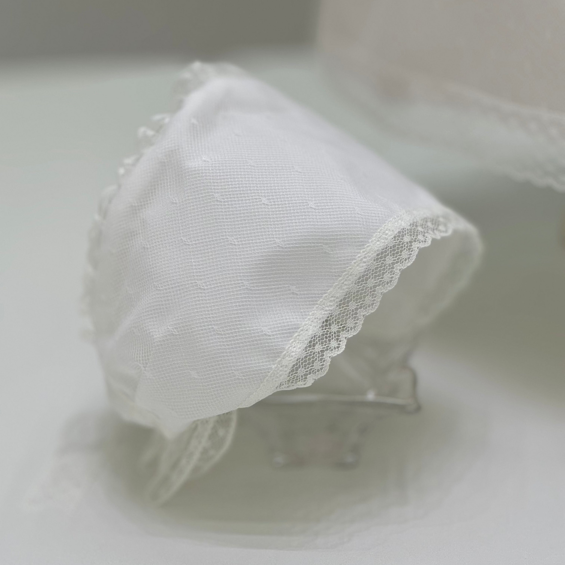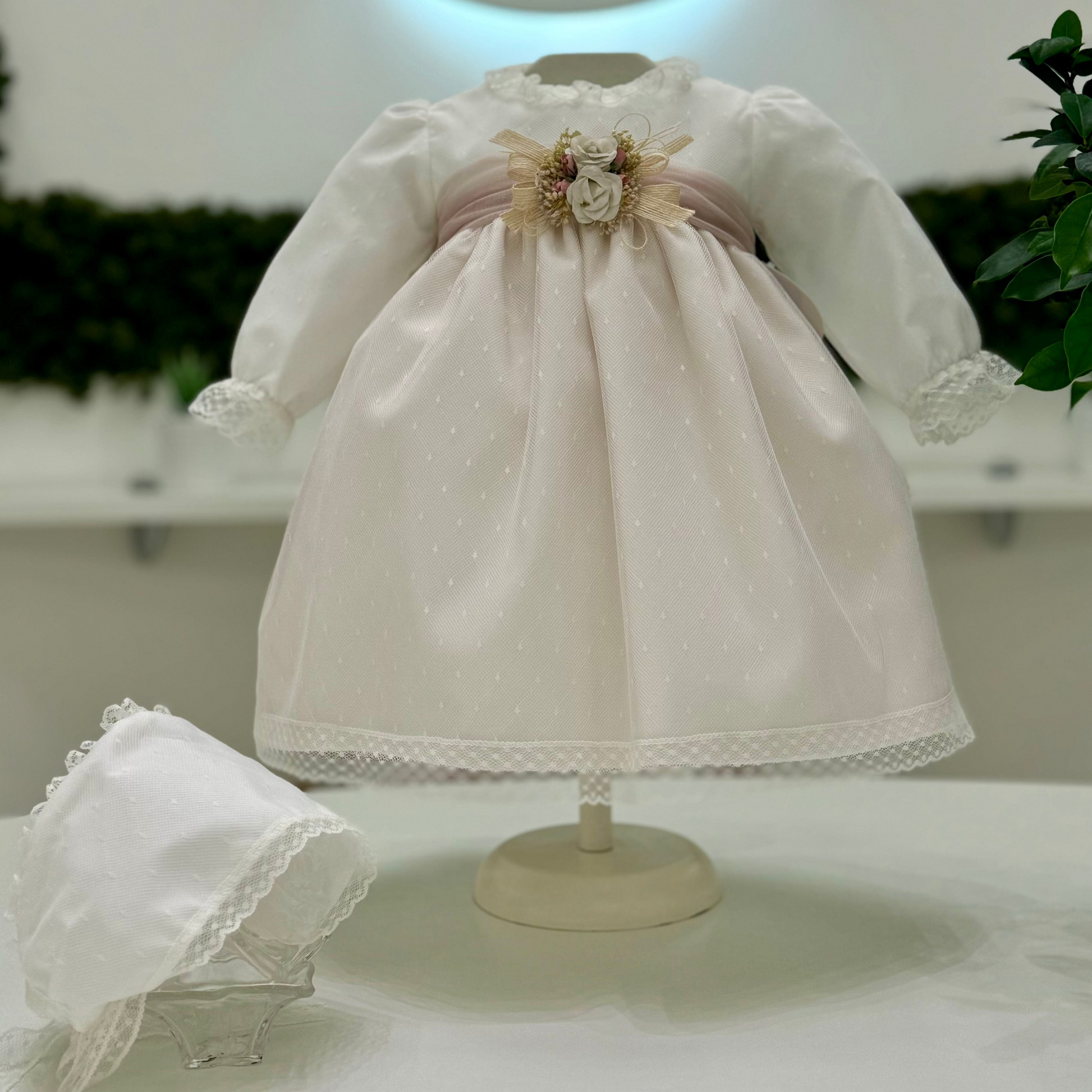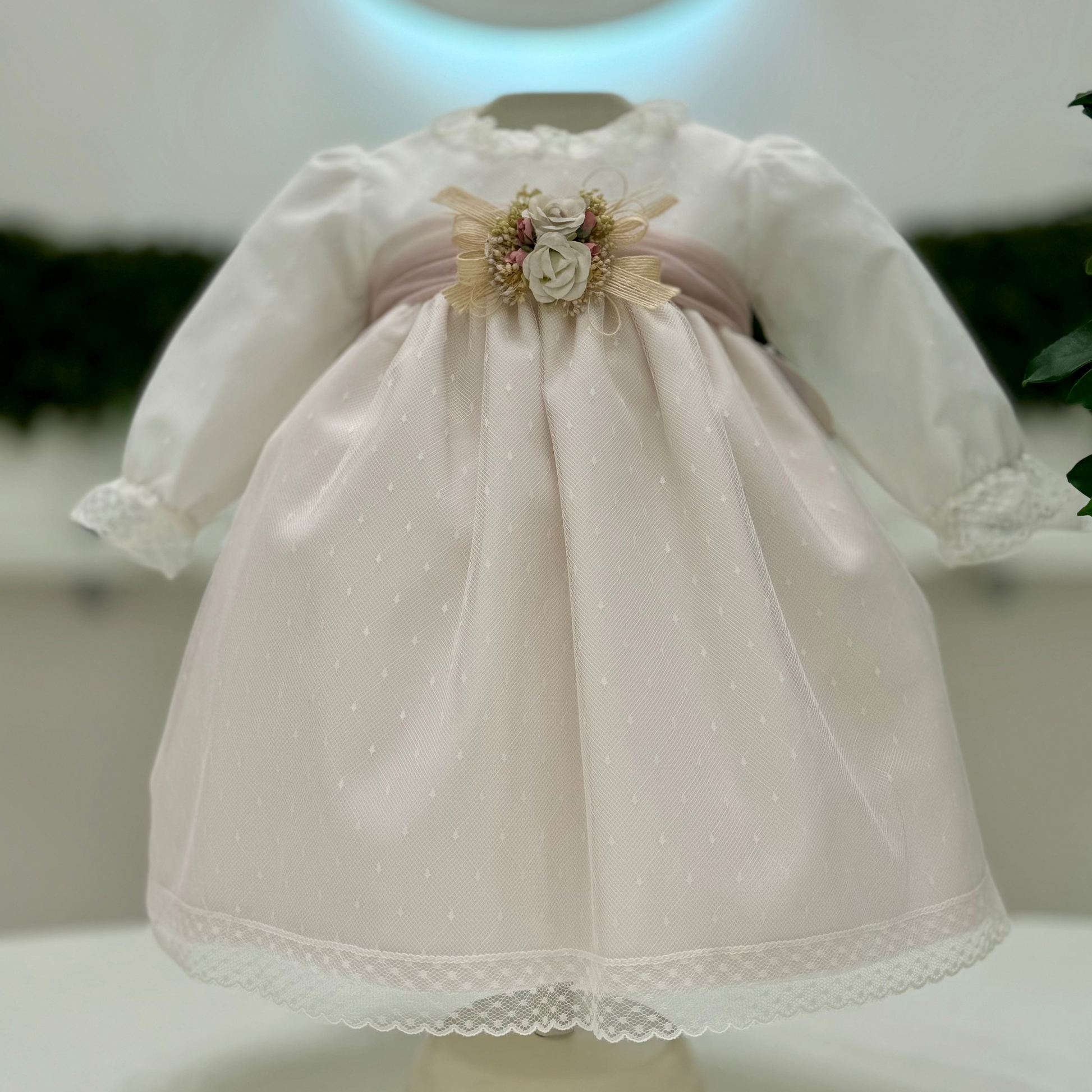 Abito battesimale per neonata con cuffia e culotte, realizzato in tulle e cotone con raffinate rifiniture in pizzo. Questo elegante abito presenta maniche lunghe foderate e una cintura con una spilla removibile, decorata con un delicato dettaglio floreale. Ideale per rendere indimenticabile il giorno del battesimo della tua piccola, unendo comfort e bellezza in un capo speciale.