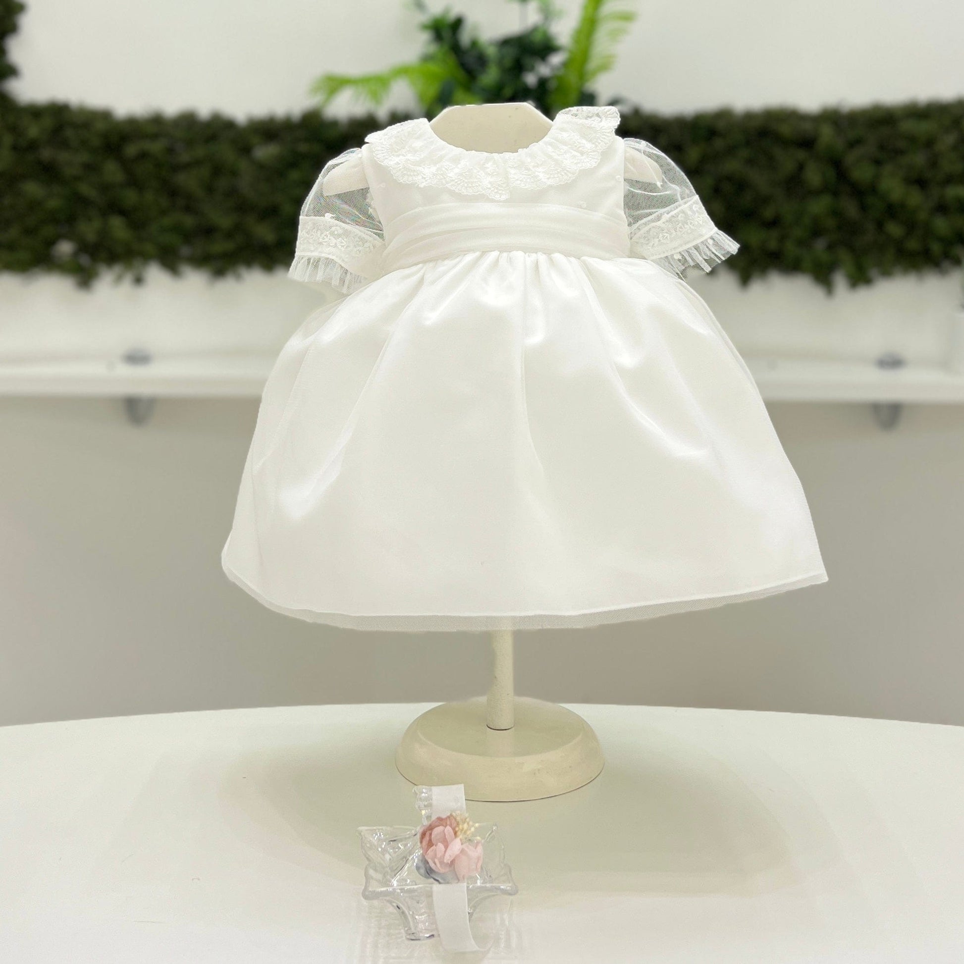 Abito battesimale in tulle con colletto in pizzo, scollo a puntina sul retro e maniche in trasparenza bordate in pizzo. La cintura in vita con fiocco completa il modello con un dettaglio delicato e raffinato.
