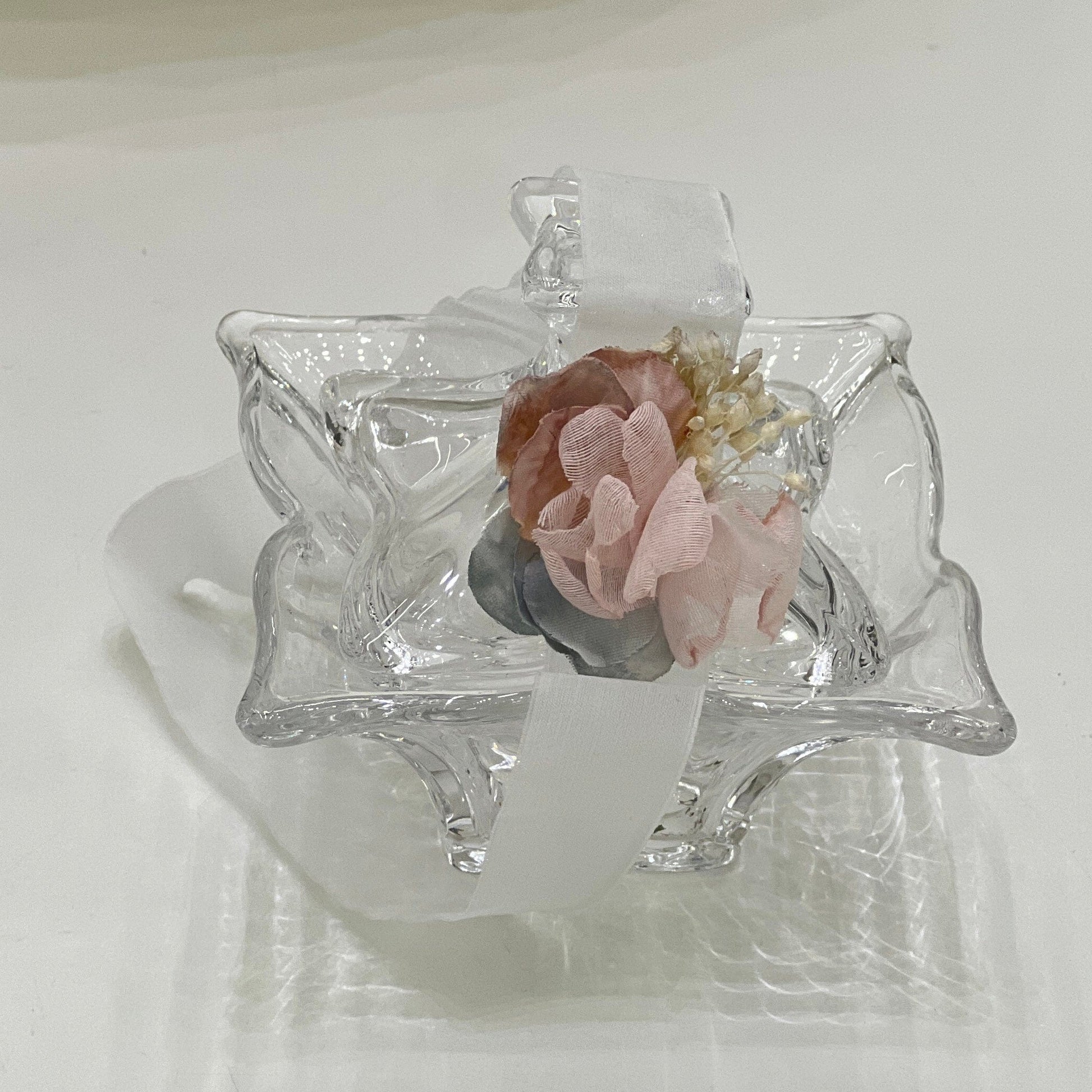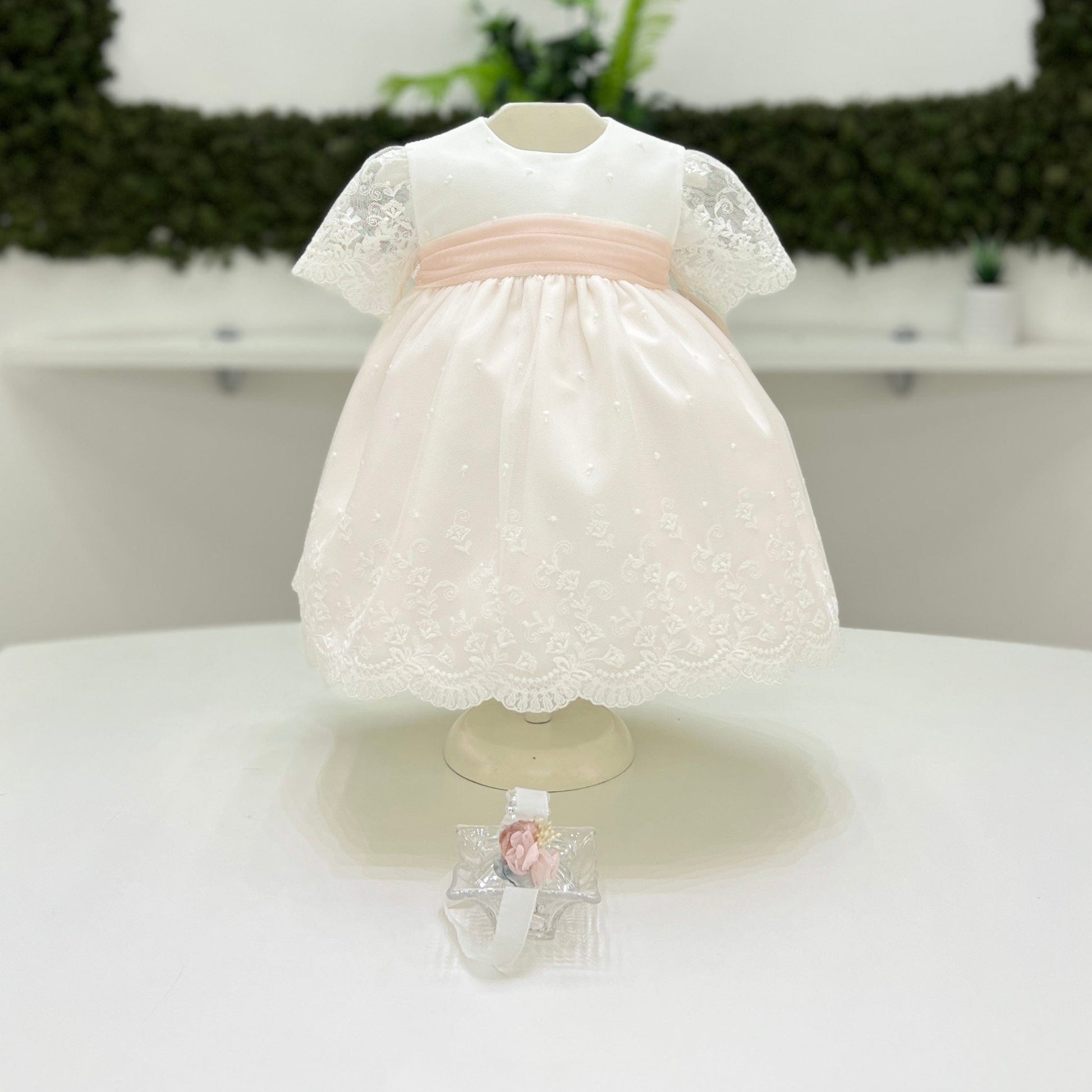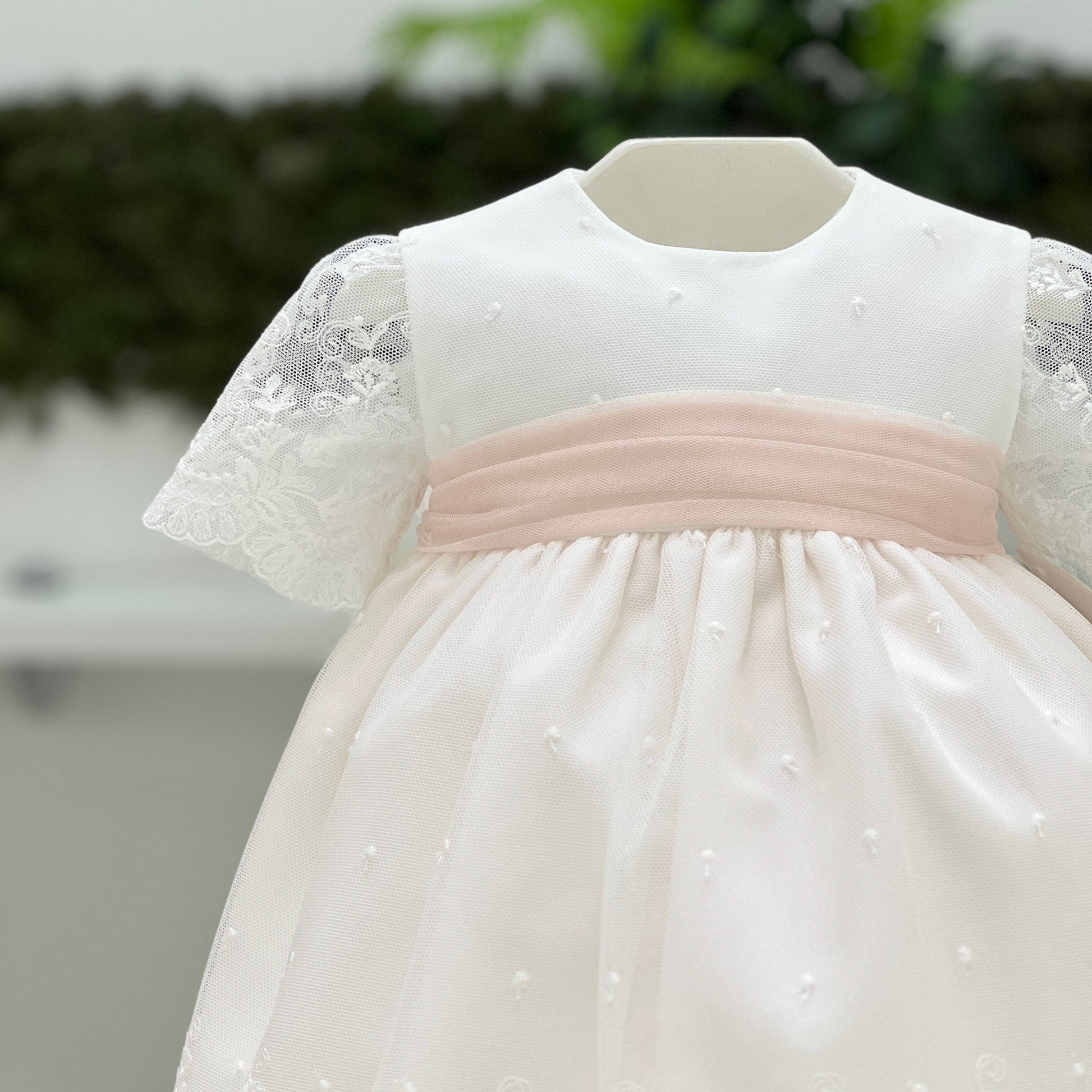 Abito elegante per neonata in tulle plumetis con smerlo in pizzo, caratterizzato da una gonna con fondo rosa pescato che si ritrova anche nella cintura in vita. La manica corta velata e la fascia con fiore coordinata completano il look con grazia e delicatezza.