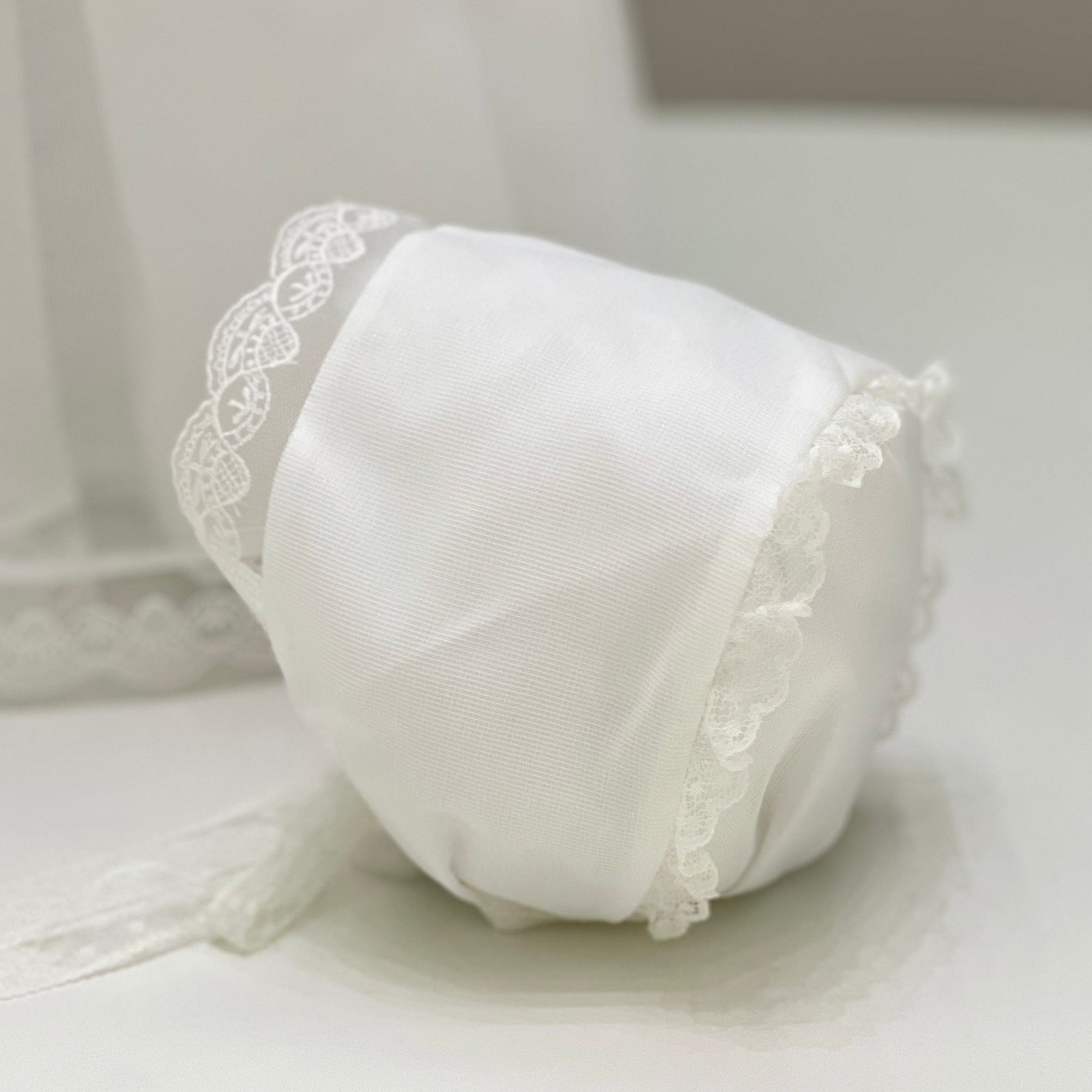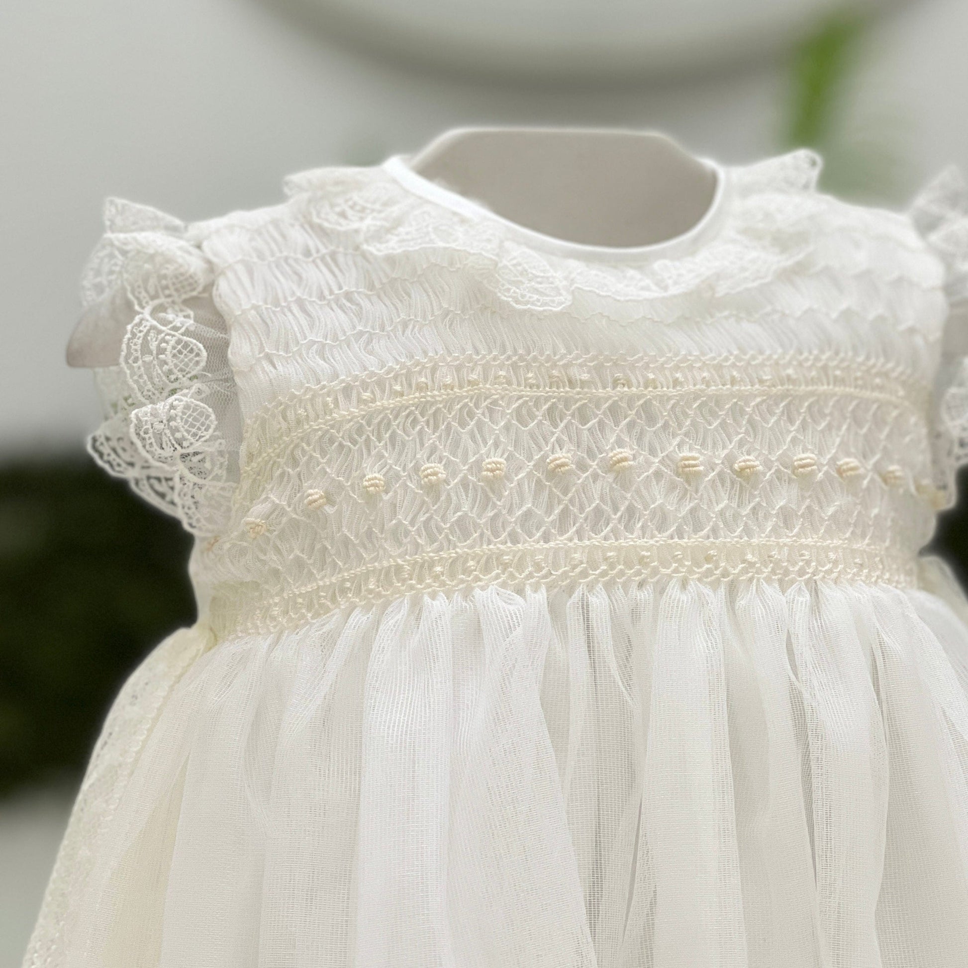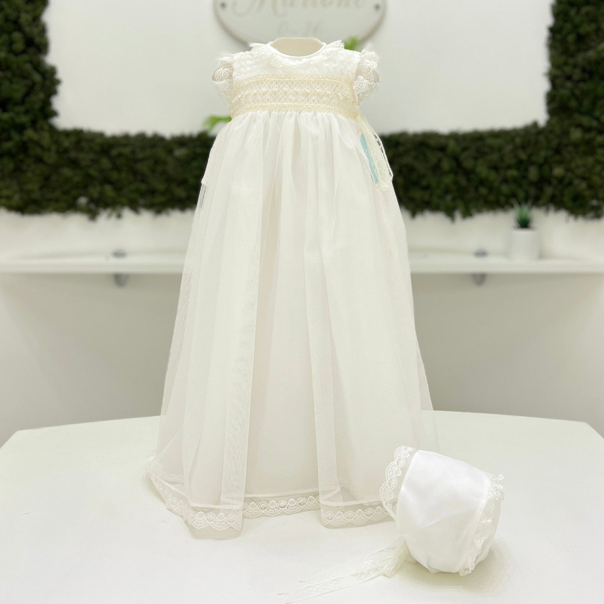 Abito tradizionale da battesimo, lungo e avvolgente, realizzato in tulle leggero con bordature in pizzo finemente lavorato. Il corpino in punto smock, impreziosito da delicati ricami beige, richiama la sartorialità di un tempo. Completa il completo la cuffia coordinata, per un’eleganza classica e senza tempo.