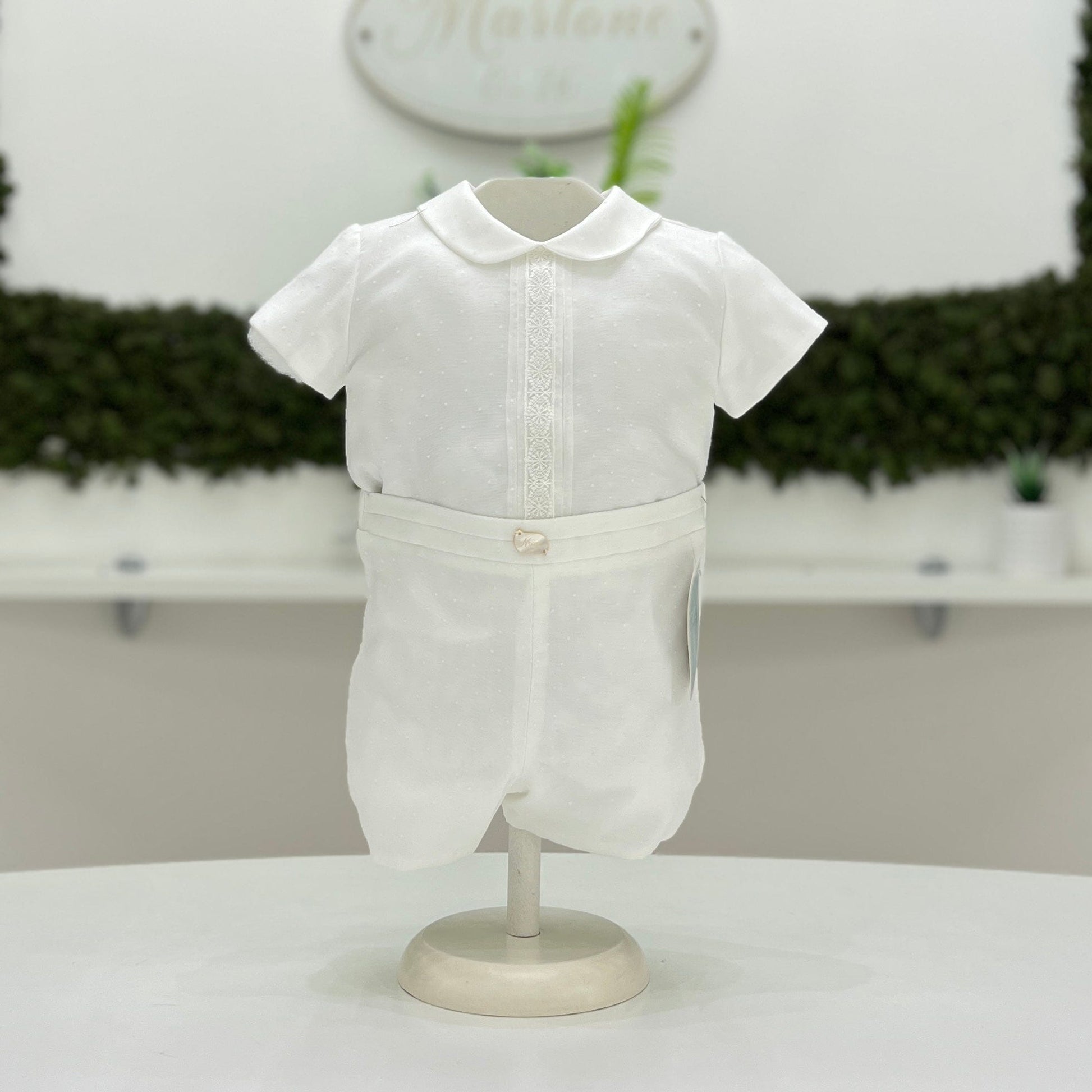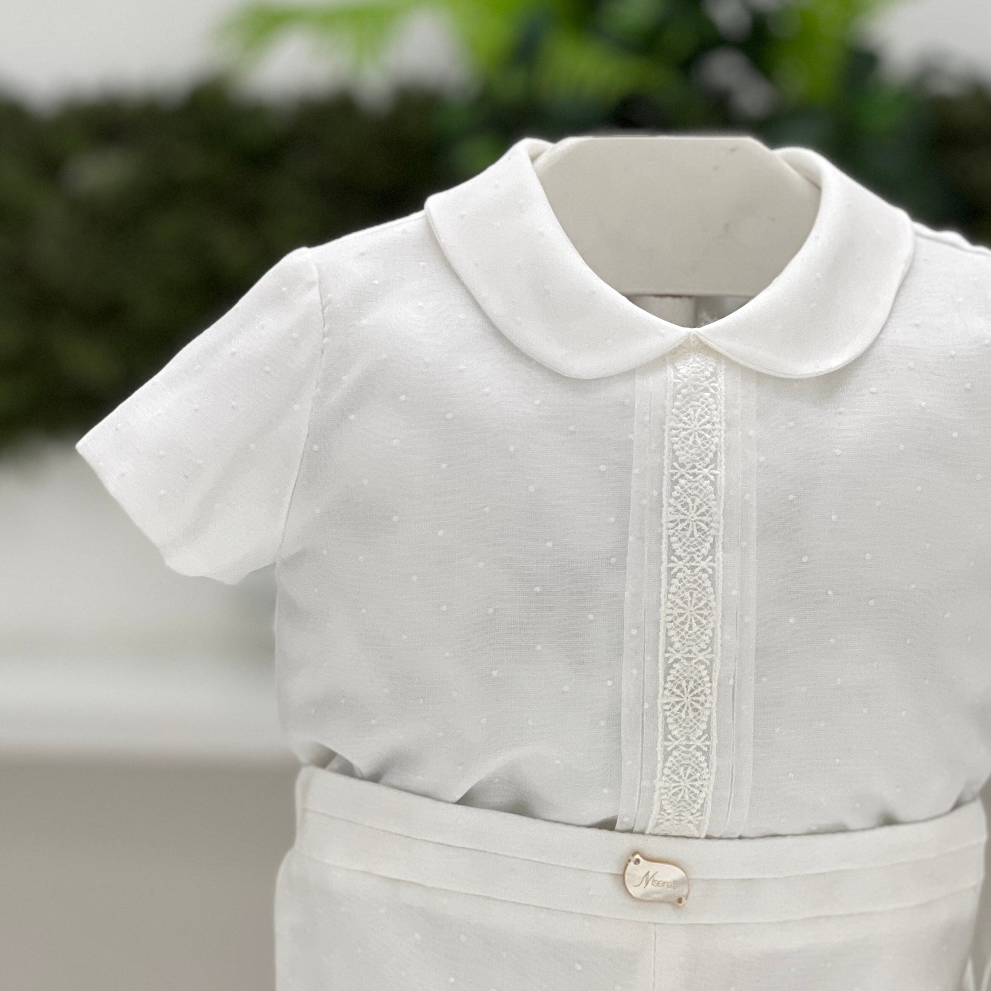 Abito battesimale per neonato composto da culotte e camicia a manica corta in tulle a pois, con delicate rifiniture in pizzo. L’abbottonatura sul retro dona praticità senza rinunciare all’eleganza di un completo dallo stile raffinato e leggero.