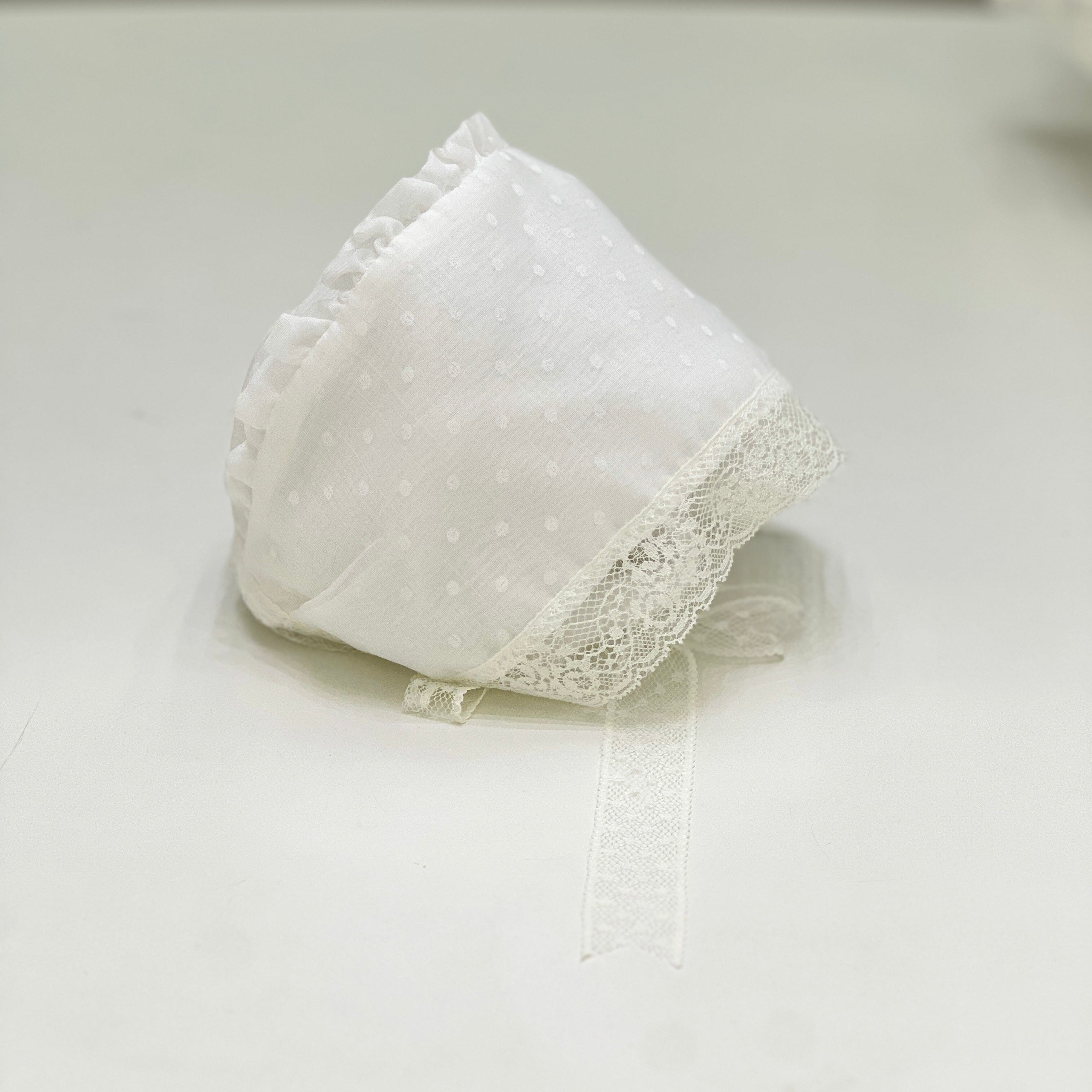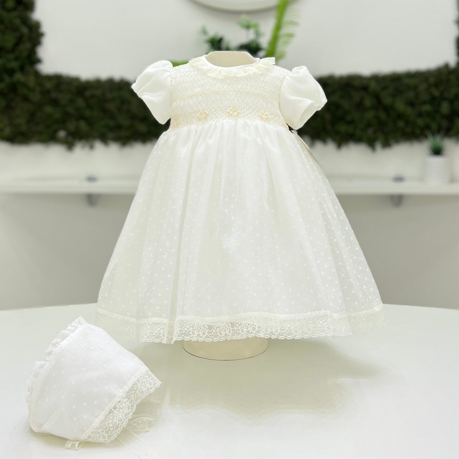 Abito elegante in tessuto a pois con corpino in punto smock, colletto in pizzo e maniche a sbuffo. La cuffia coordinata aggiunge un tocco di dolcezza a un completo pensato per le occasioni più speciali.