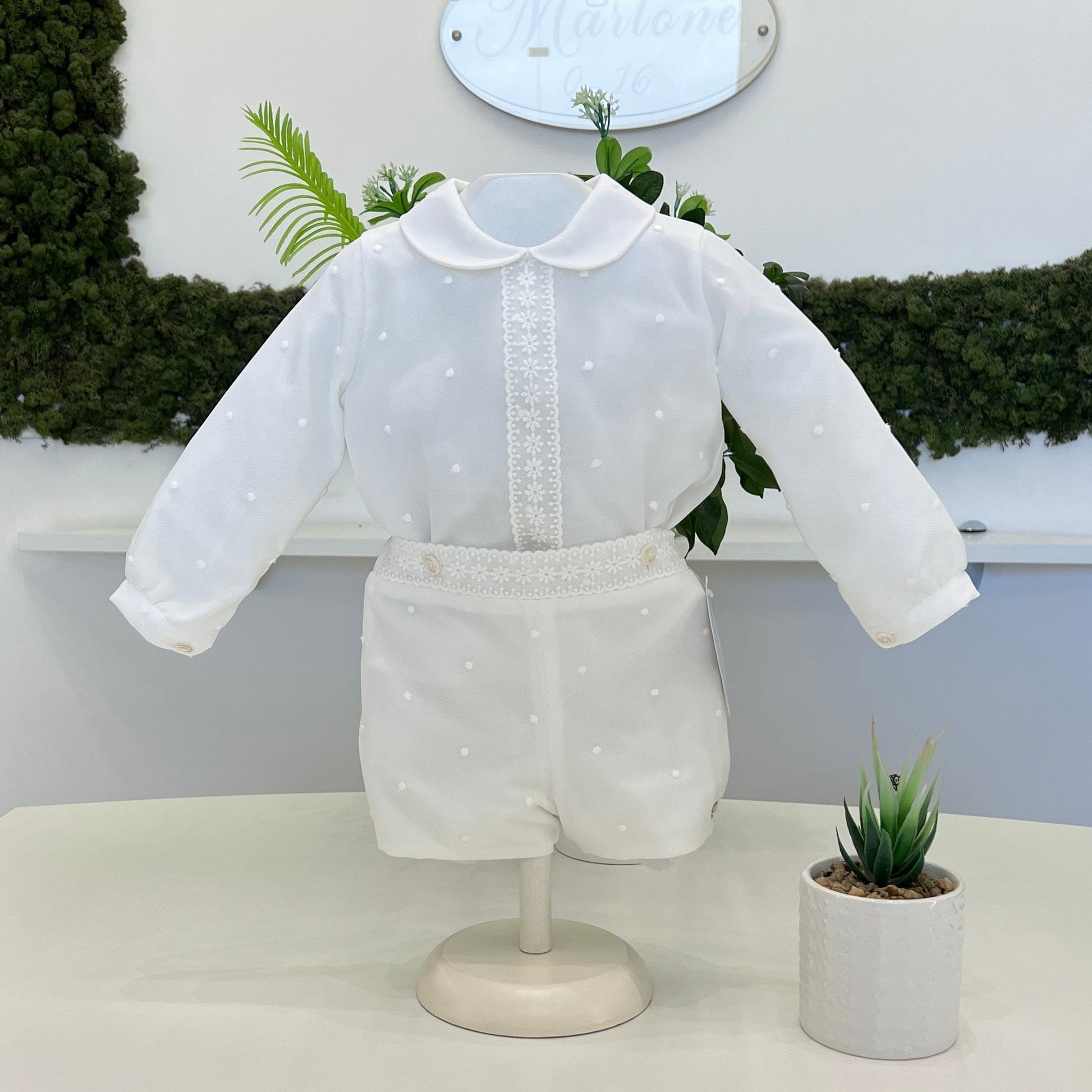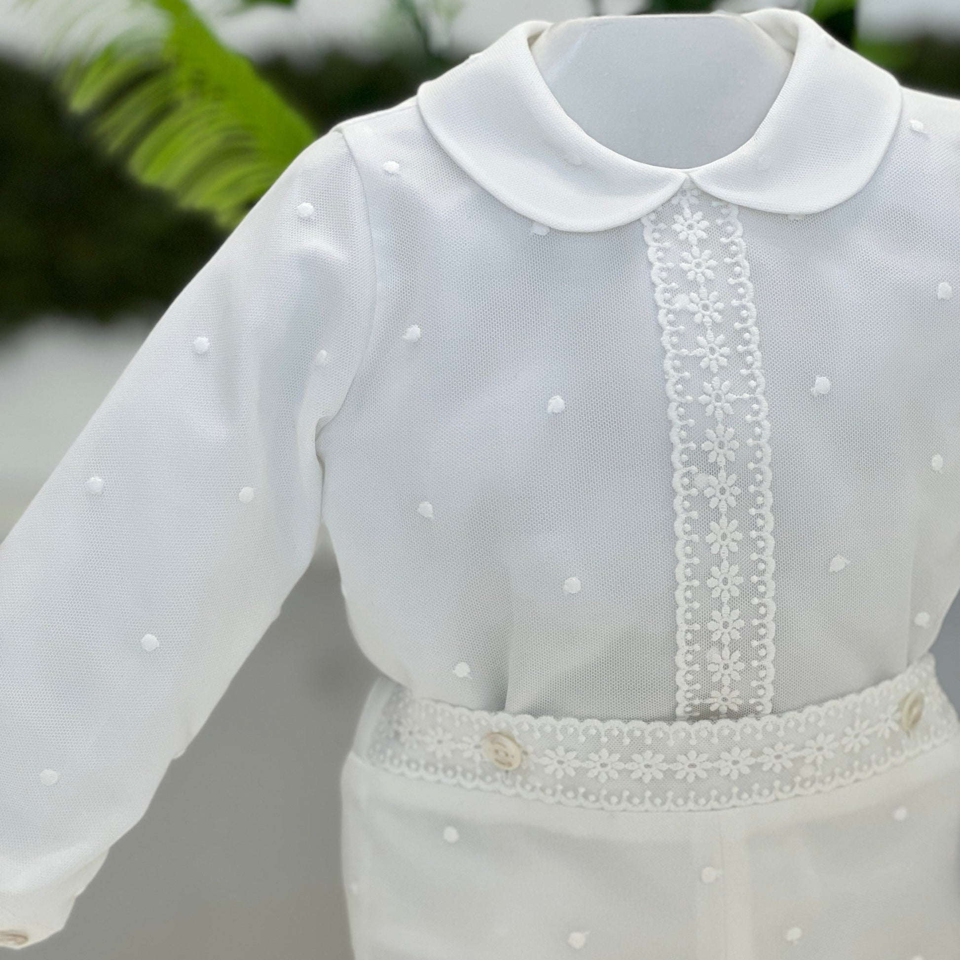 Completo battesimale in organza e seta ricamata a pois, con camicia impreziosita da colletto tondo e inserto verticale in pizzo floreale. La fascia in vita, decorata da passamaneria coordinata con bottoncini laterali, definisce la silhouette con delicatezza. Un ensemble cerimoniale curato nei dettagli, pensato per un battesimo dall’estetica raffinata e senza tempo.