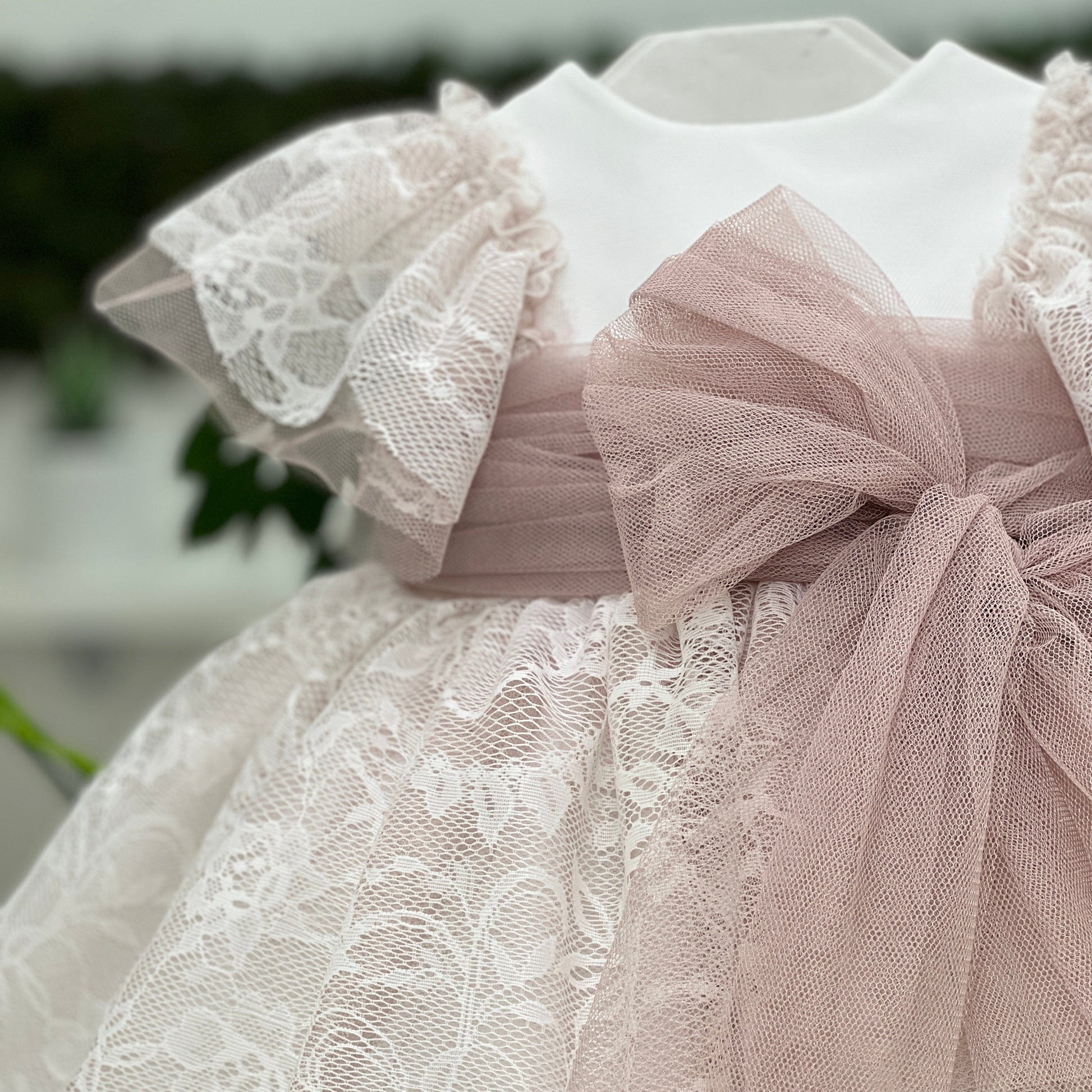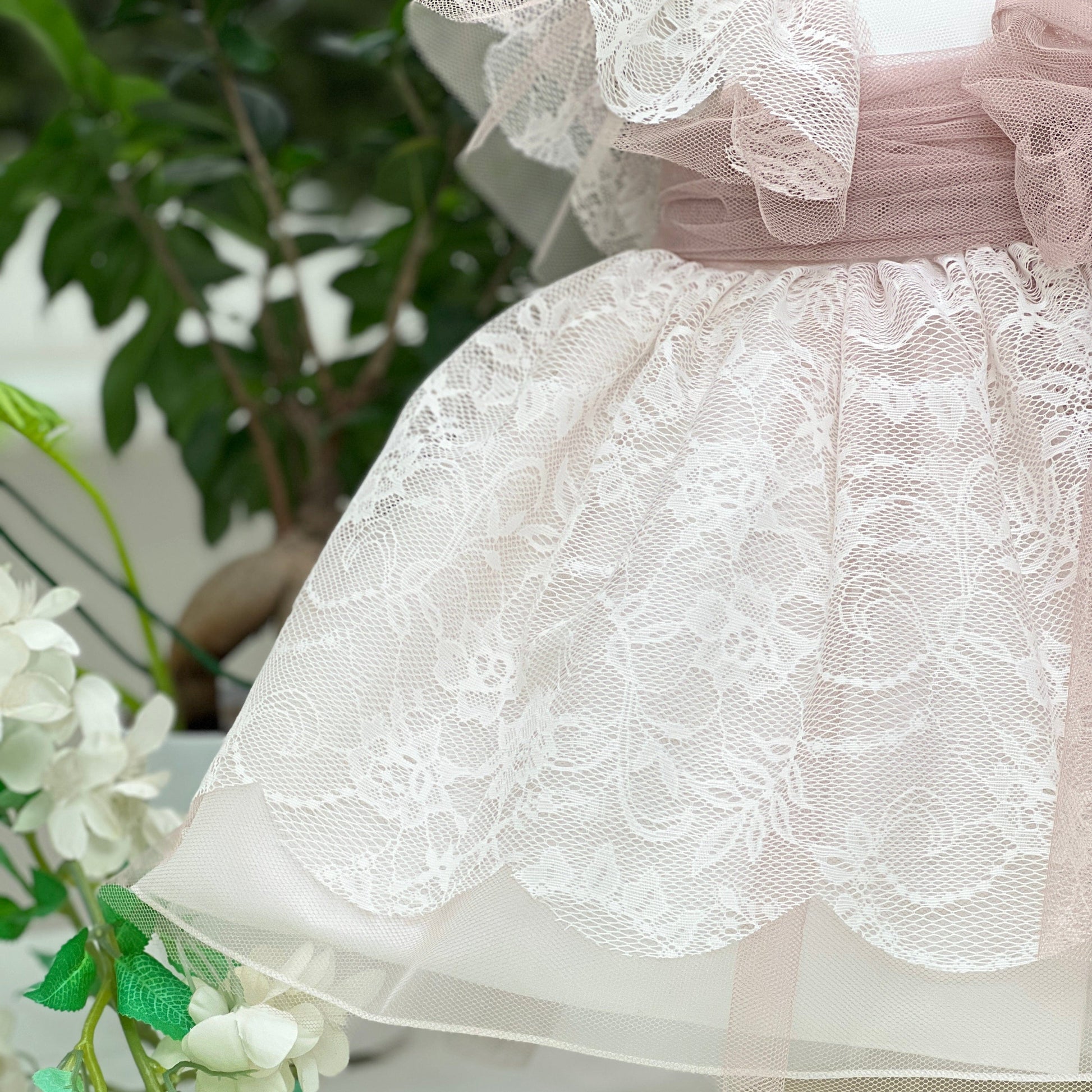 Abito in tulle e pizzo. La gonna foderata è rivestita da una balza in tulle rosa antico a cui è sovrapposta un'ulteriore balza in pizzo bianca, la stessa lavorazione sovrapposta si ripete sulle balze della manica ad aletta, lasciando il corpetto bianco pulito ed in vita l'abito viene completato da una cintura in tulle.