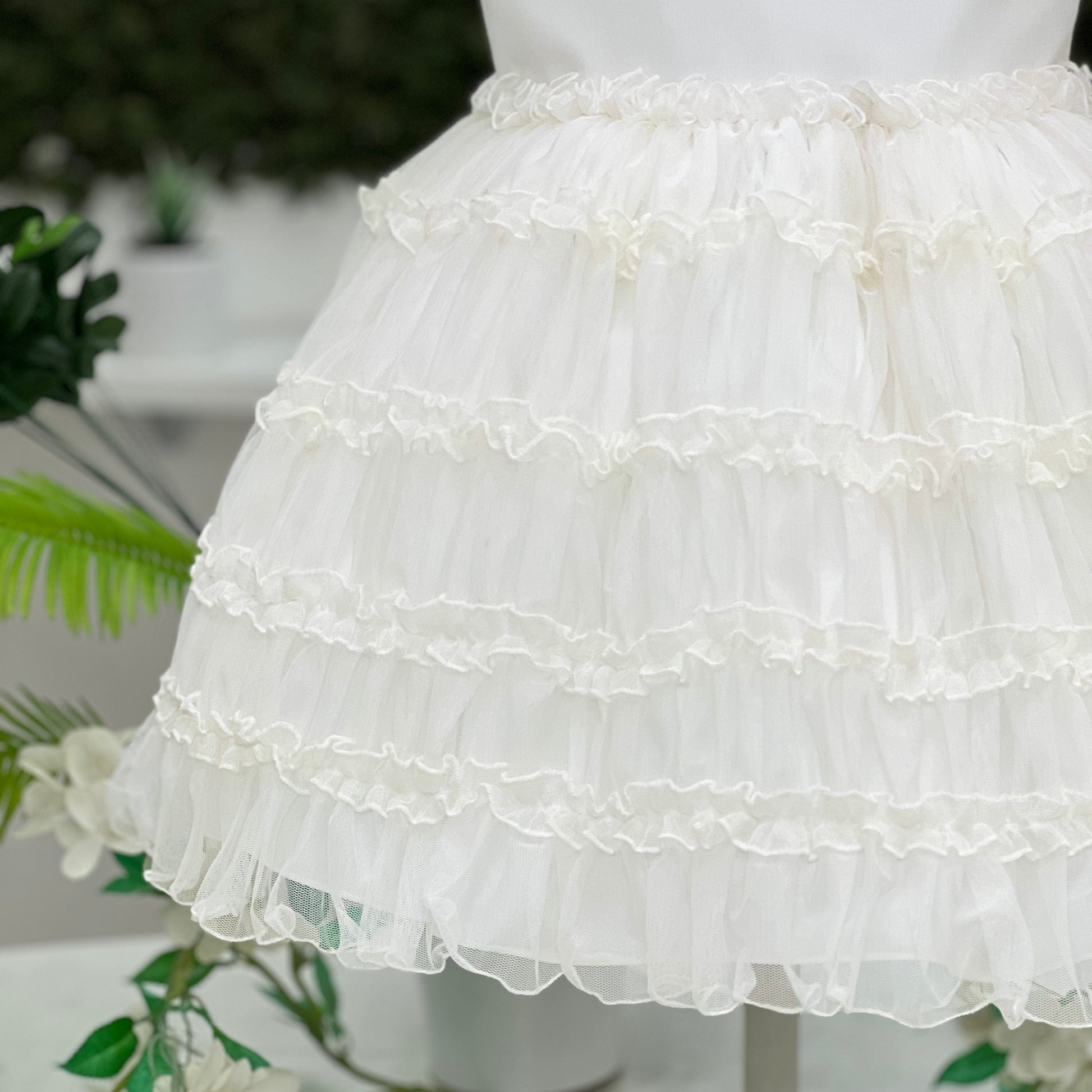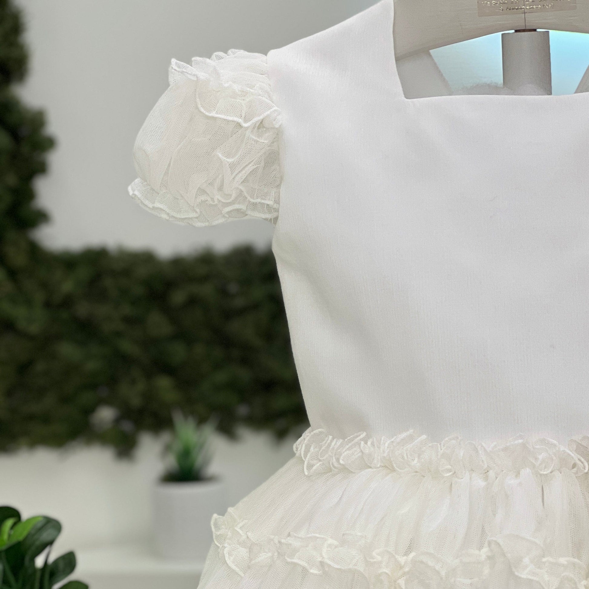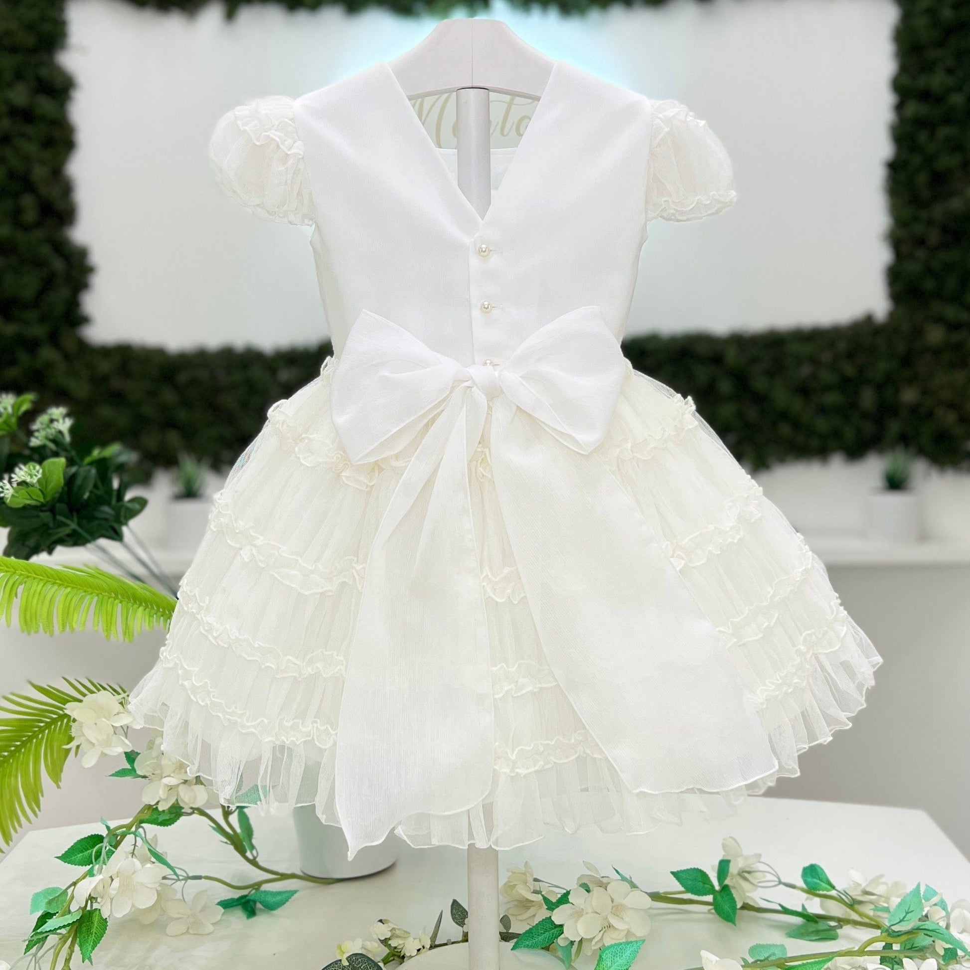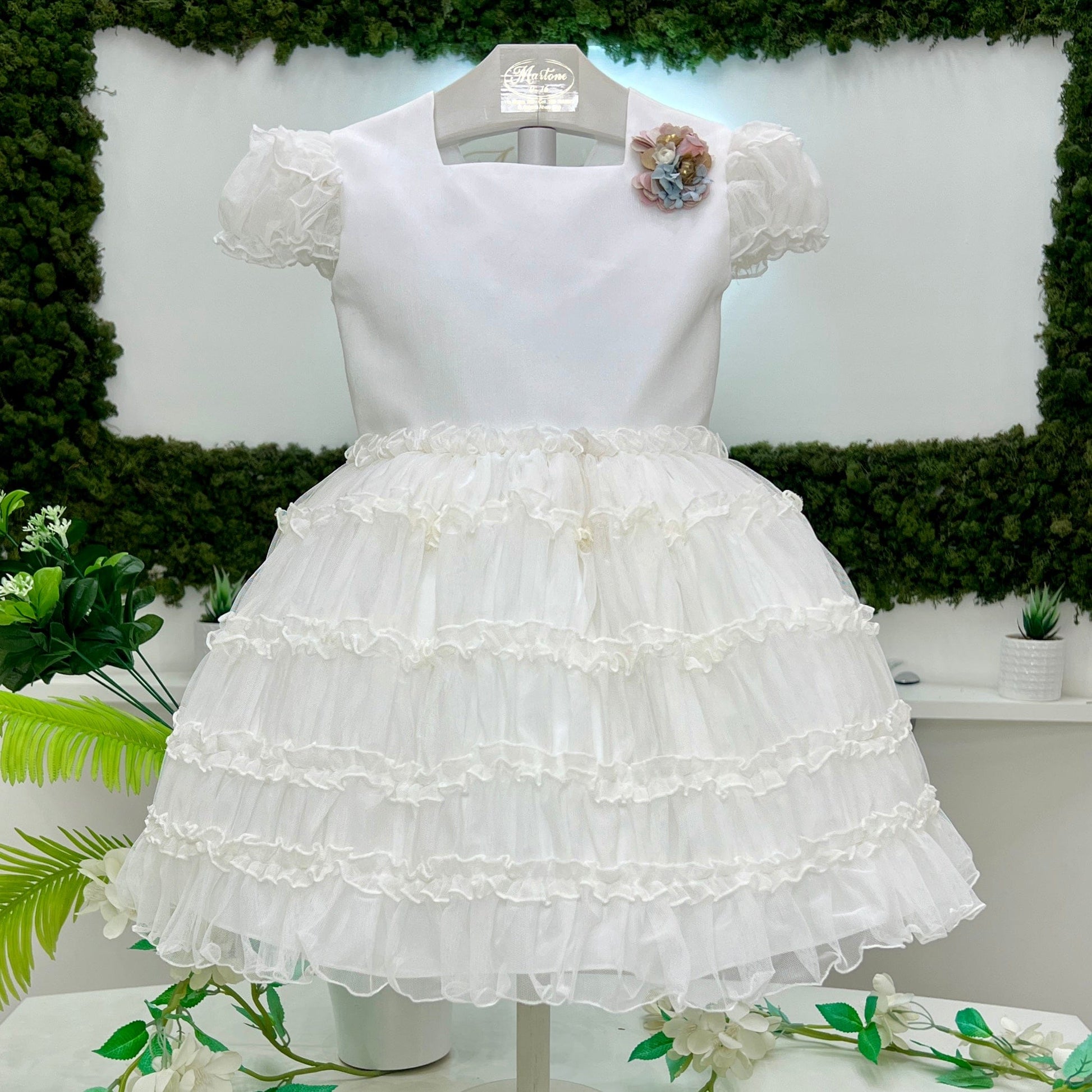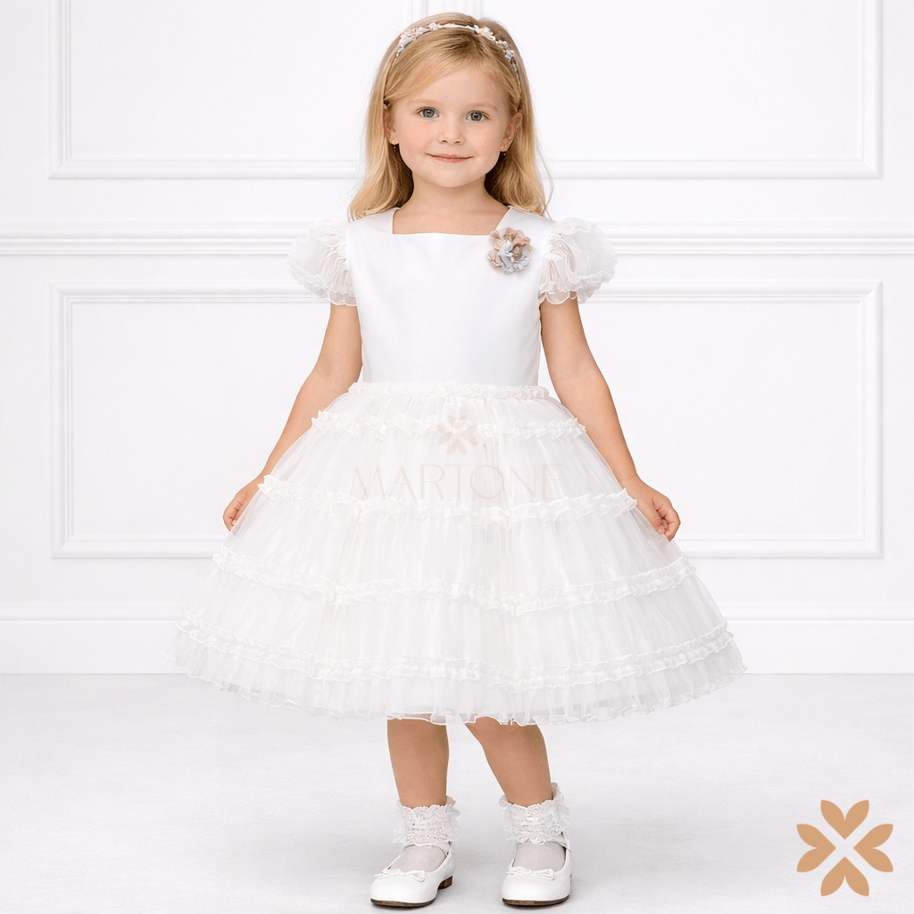 Abito in organza e tulle a balze arricciate, con maniche a palloncino coordinate. Spilla con fiocco sul retro e dettaglio floreale sul davanti per un tocco raffinato.