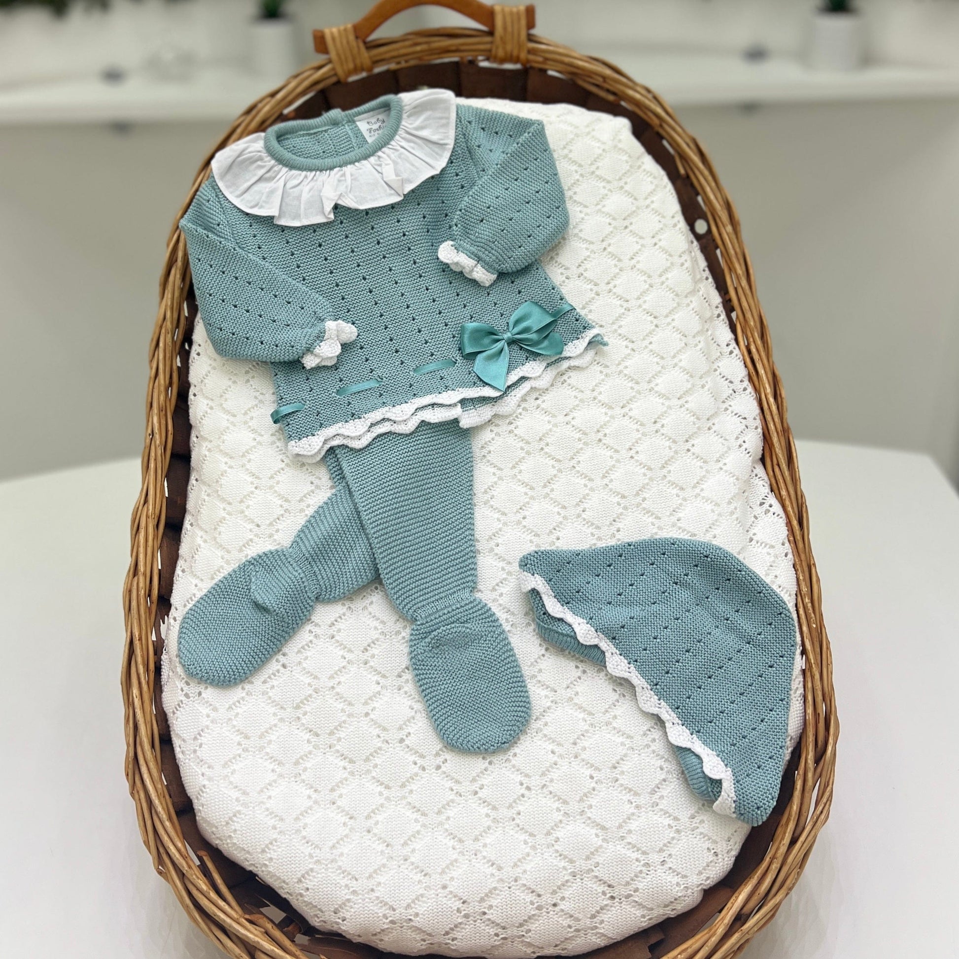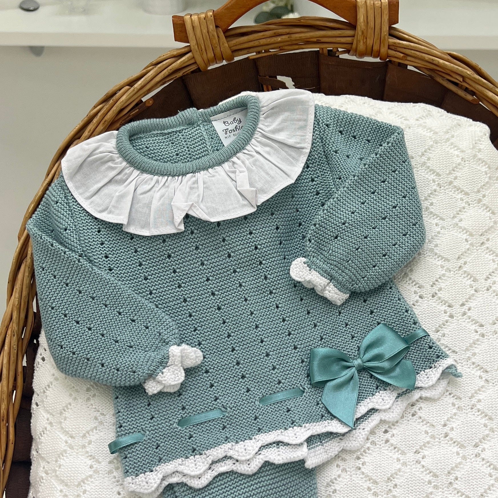 Tutina spezzata in filo di cotone traforato, con maglia impreziosita da colletto con rouches e passanastro con fiocco. Completa di cuffia coordinata, in un raffinato verde acqua.