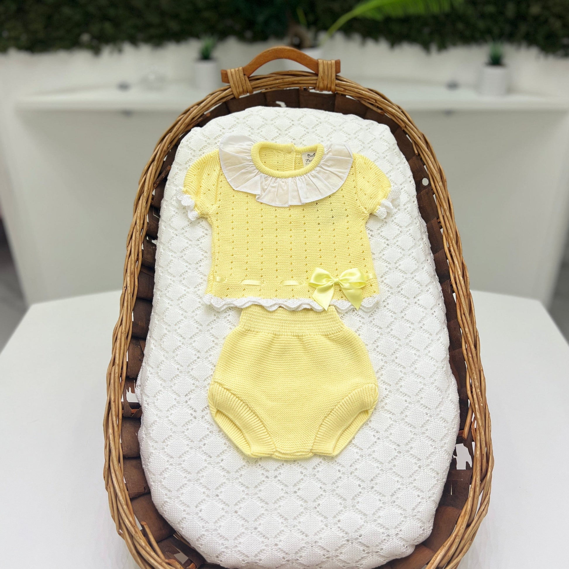Completo corto in filo di cotone traforato per neonata, composto da maglia con colletto con rouches e passanastro con fiocco, abbinata a culotte coordinata, per un look delicato e raffinato.